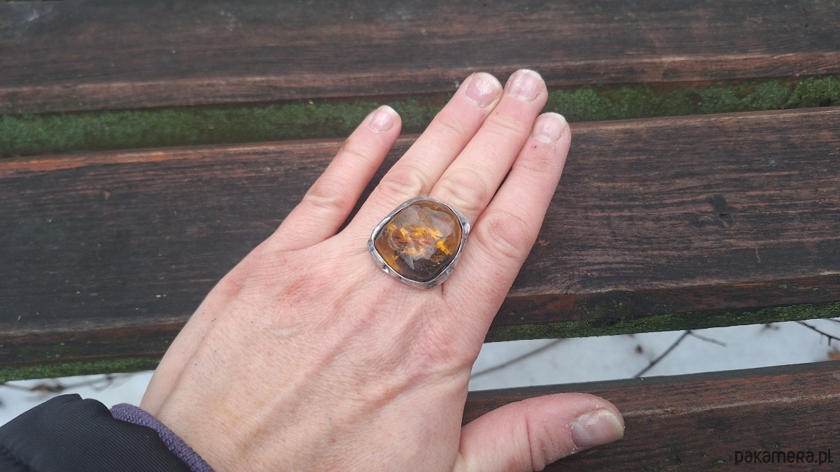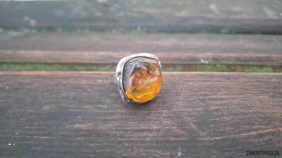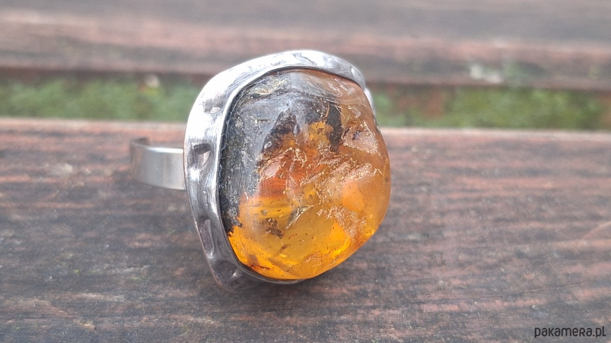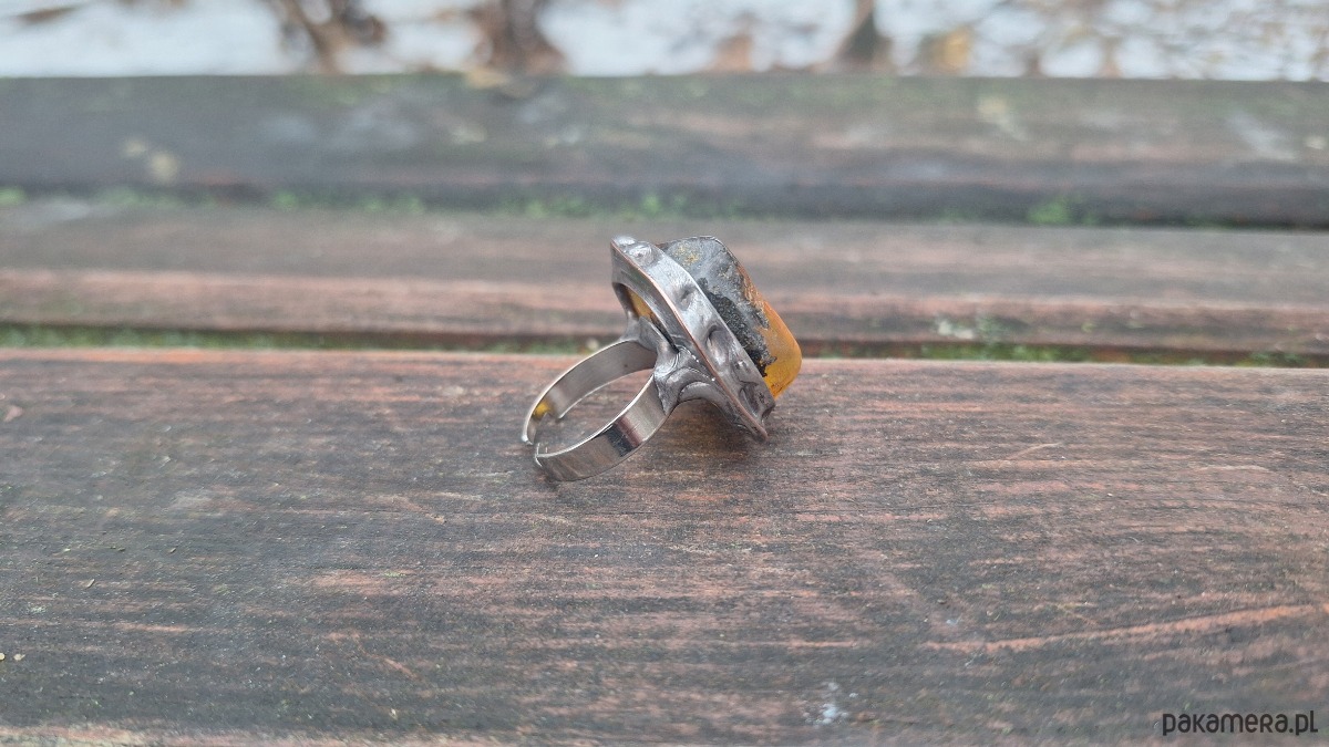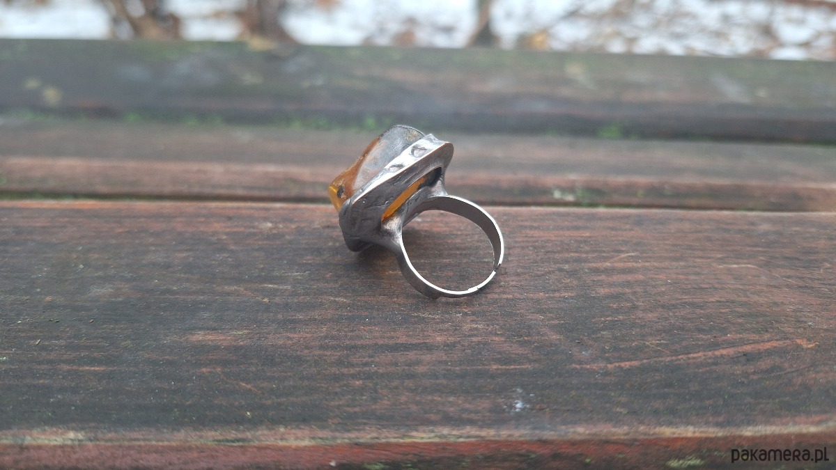 Pierścionek wykonany z miedzi, cyny i bursztynu. Wymiary ok. 2.5 na 2.5 cm. Regulowany. Nie jest ciężki.
