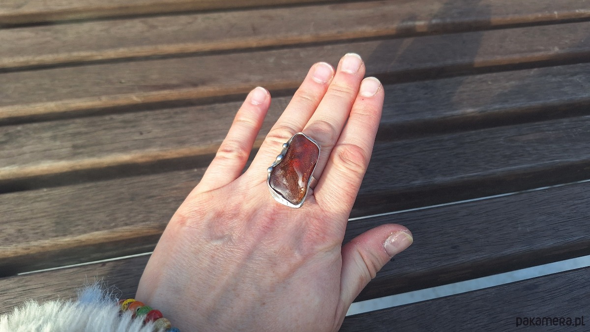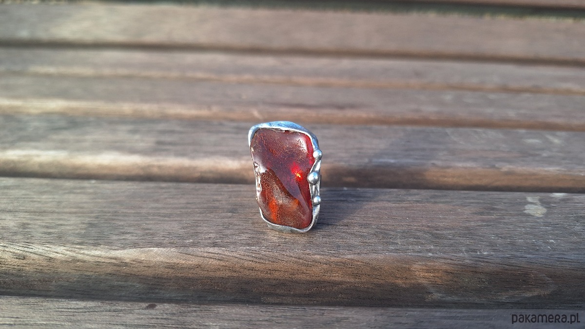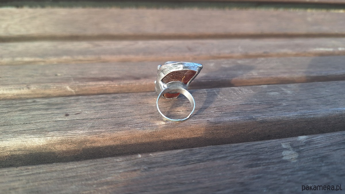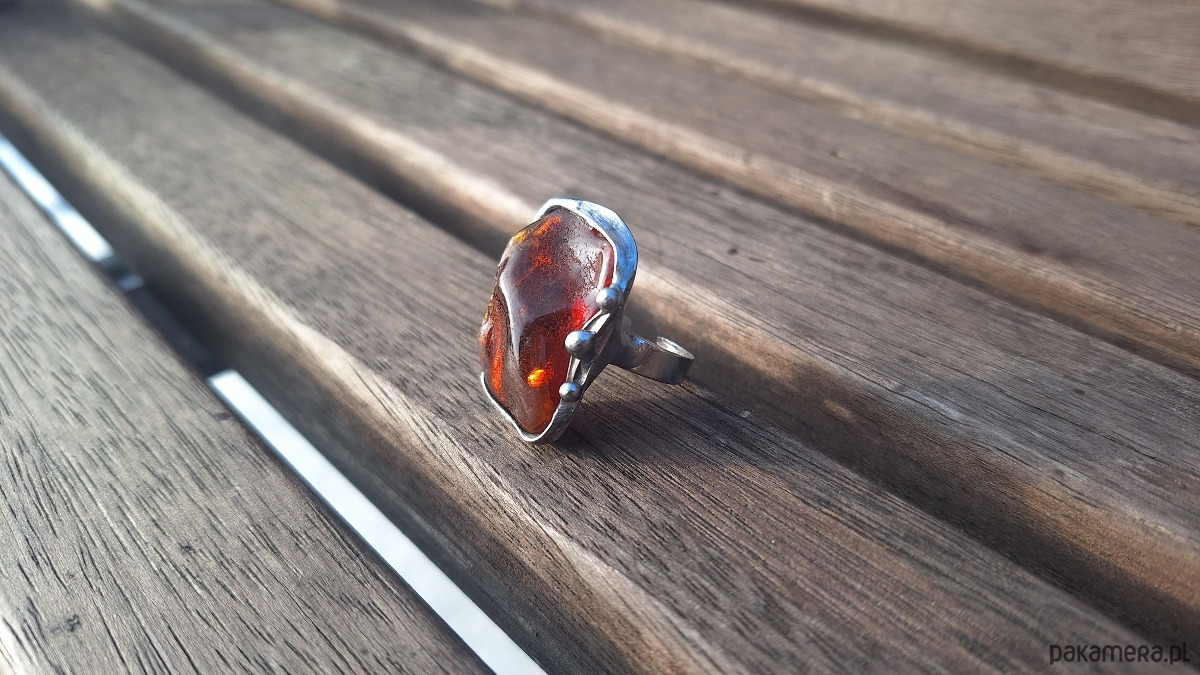 Pierścionek wykonany z miedzi, cyny i bursztynu. Wymiary ok. 3 na 2 cm. Regulowany. Nie jest ciężki.