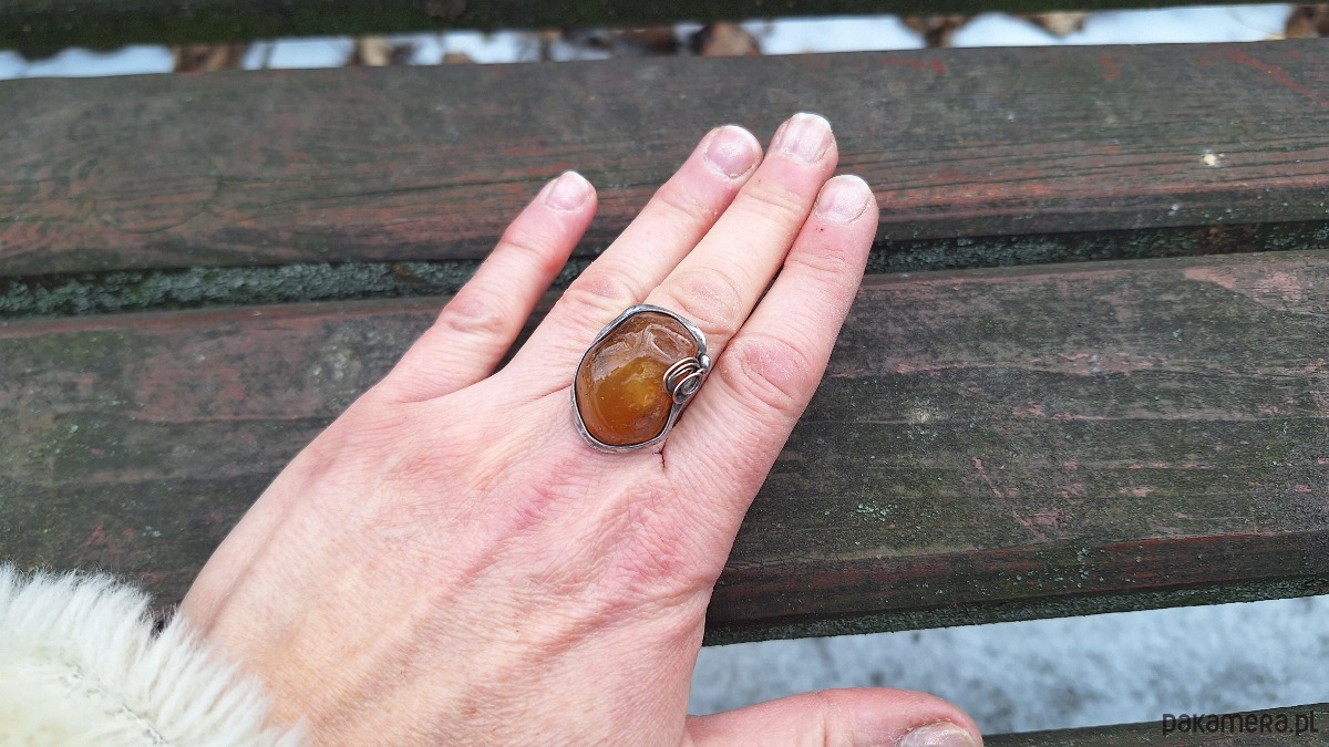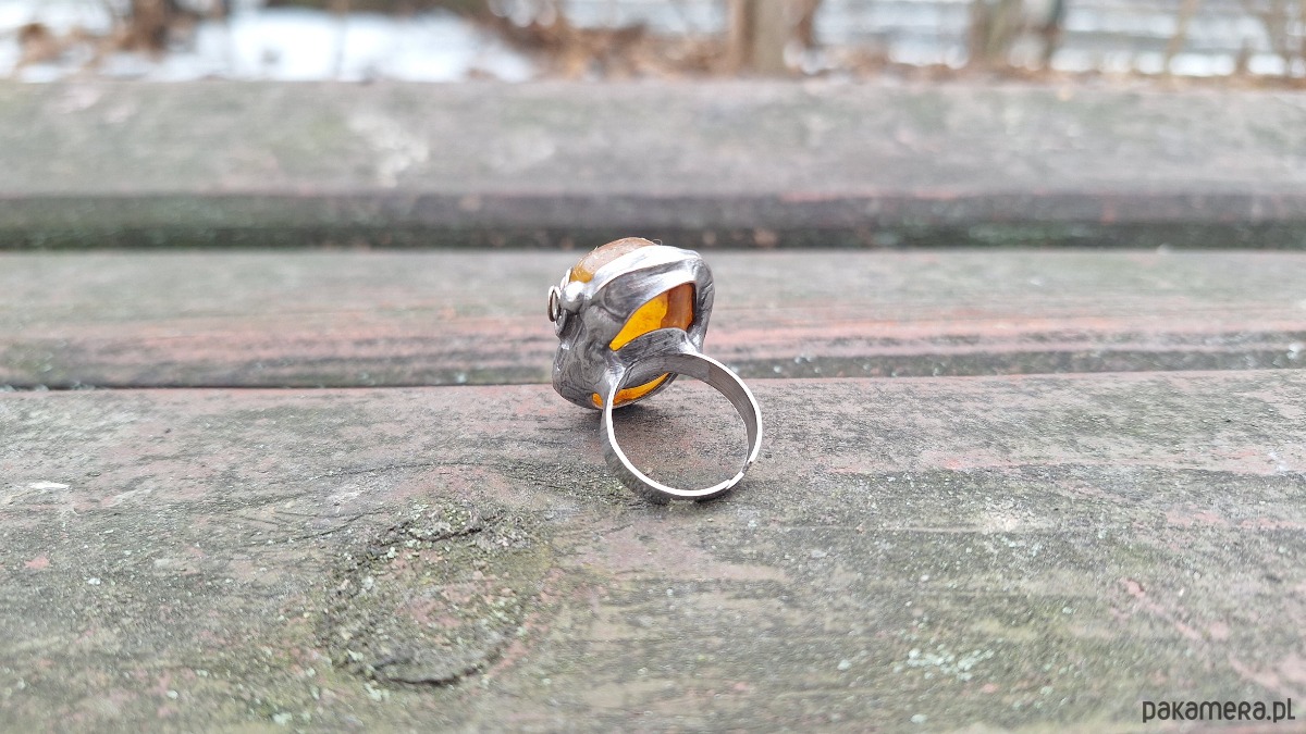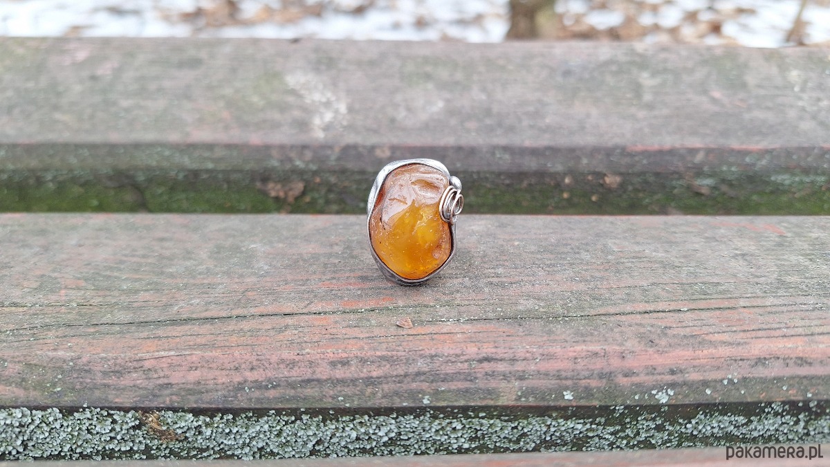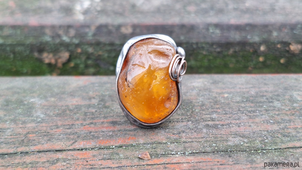 Pierścionek wykonany z miedzi, cyny i bursztynu. Wymiary ok. 2.5 na 2 cm. Regulowany. Nie jest ciężki.