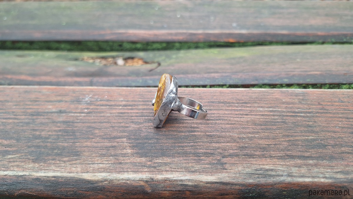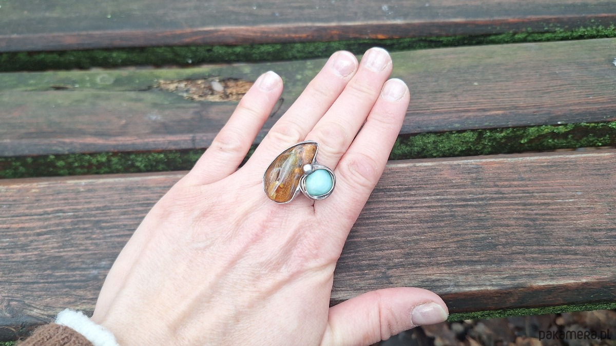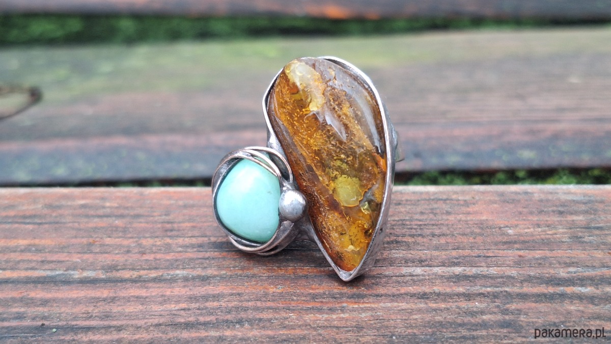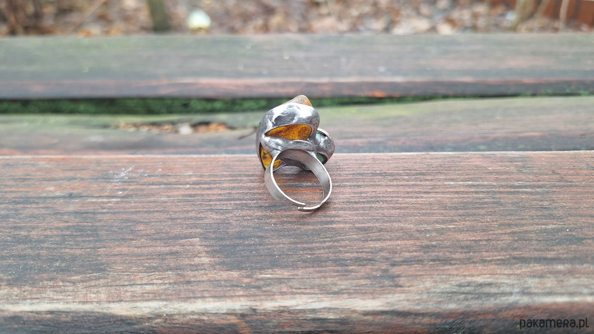 Pierścionek wykonany z miedzi, cyny, chryzoprazu i bursztynu. Wymiary ok. 3 na 2.5 cm. Regulowany. Nie jest ciężki.