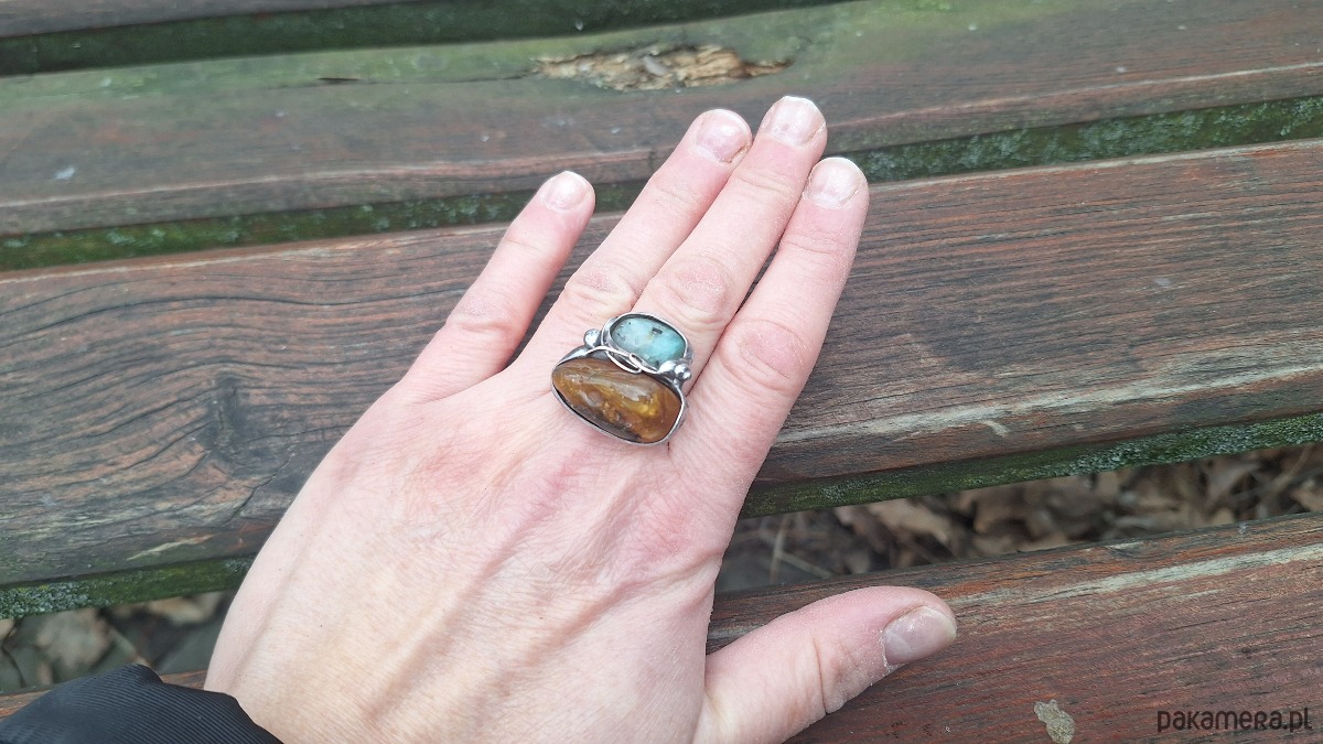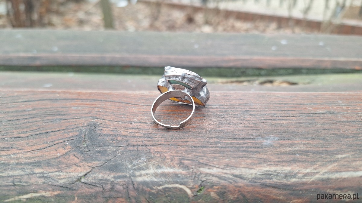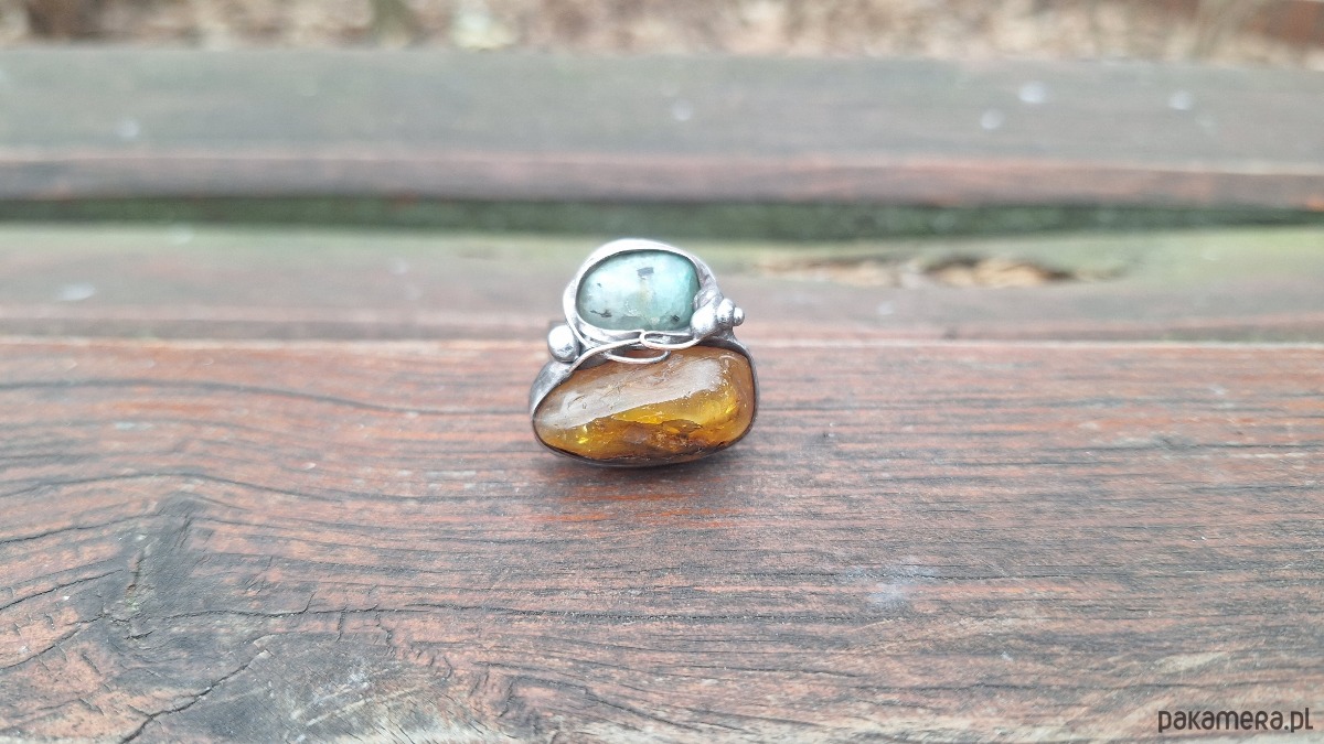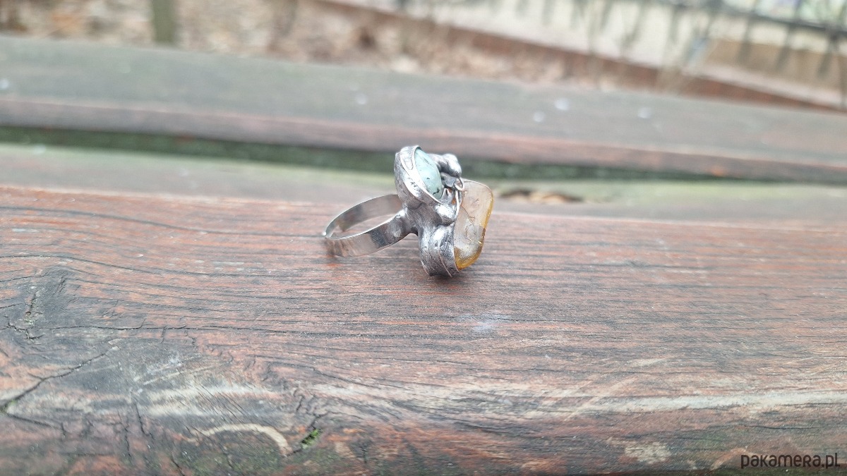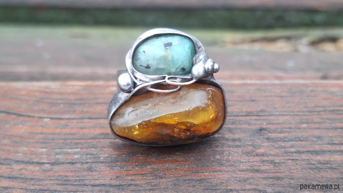 Pierścionek wykonany z miedzi, cyny, chryzoprazu i bursztynu. Wymiary ok. 2 na 2.5 cm. Regulowany. Nie jest ciężki.