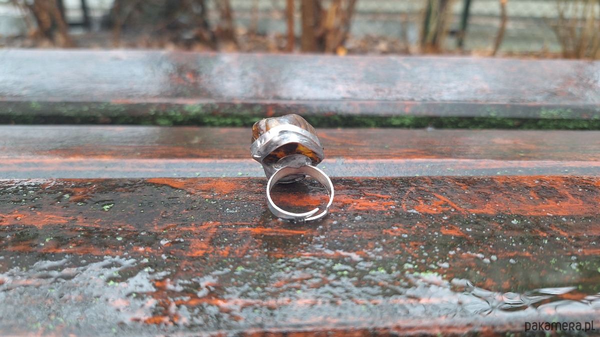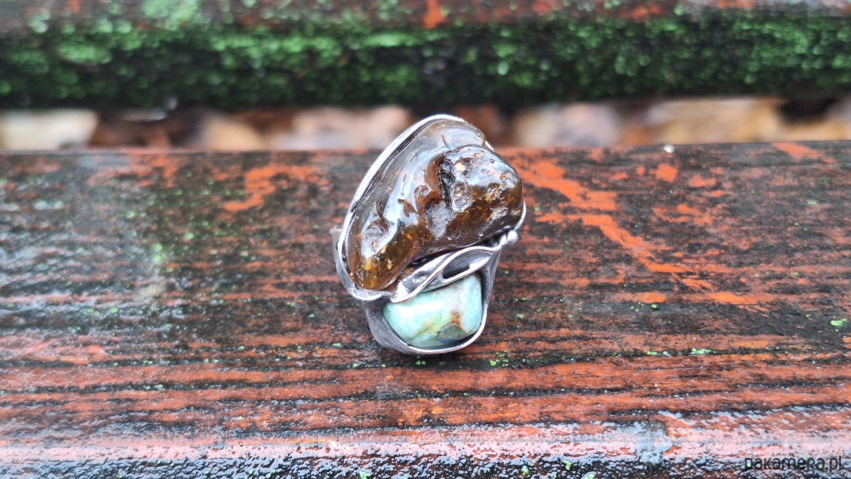 Pierścionek wykonany z miedzi, cyny, chryzoprazu i bursztynu. Wymiary ok. 2.5 na 2 cm. Regulowany. Nie jest ciężki.