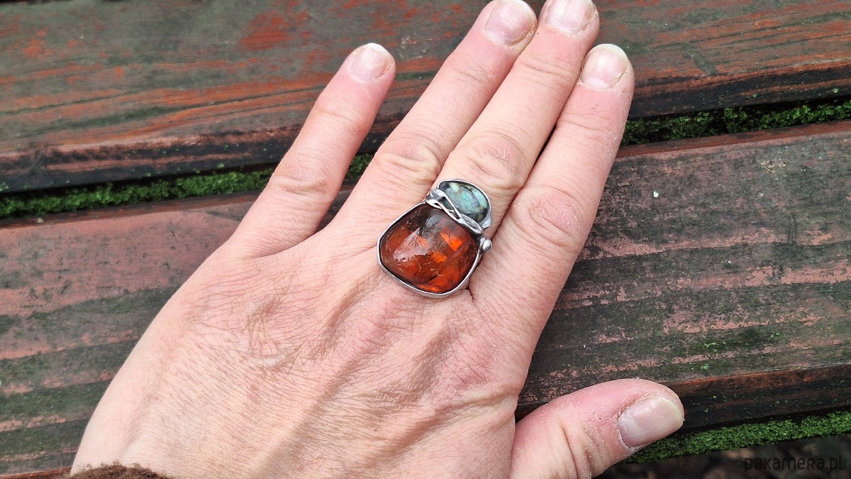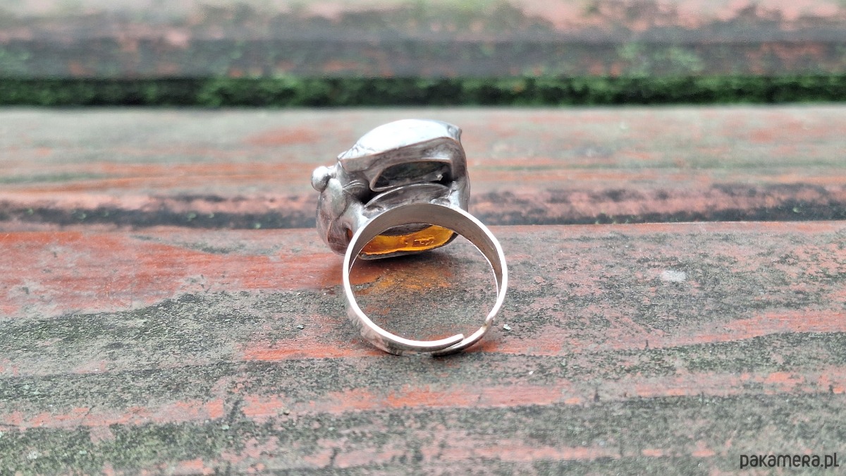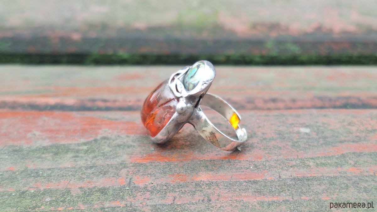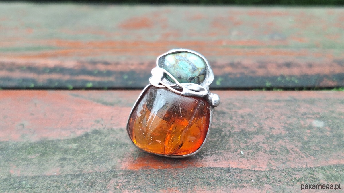 Pierścionek wykonany z miedzi, cyny, chryzoprazu i bursztynu. Wymiary ok. 2.5 na 2 cm. Regulowany. Nie jest ciężki.
