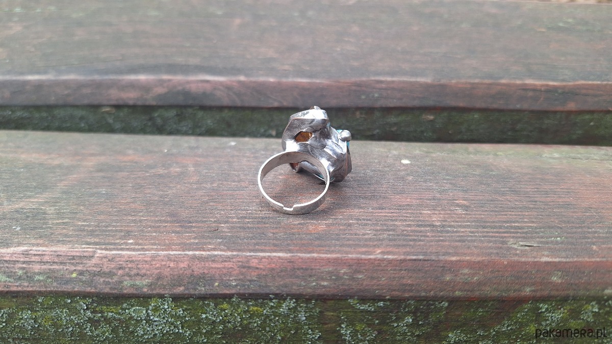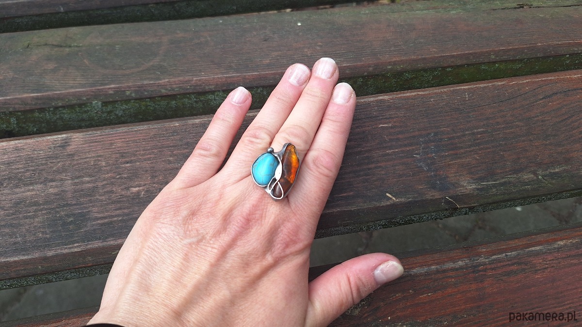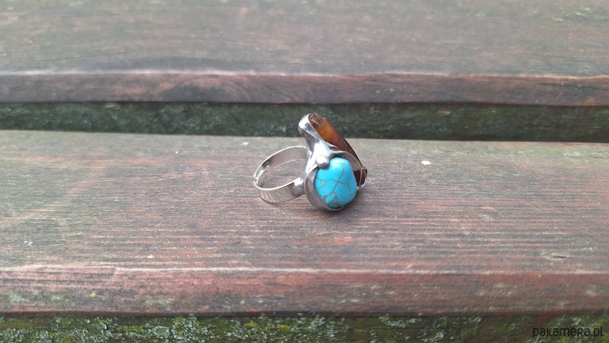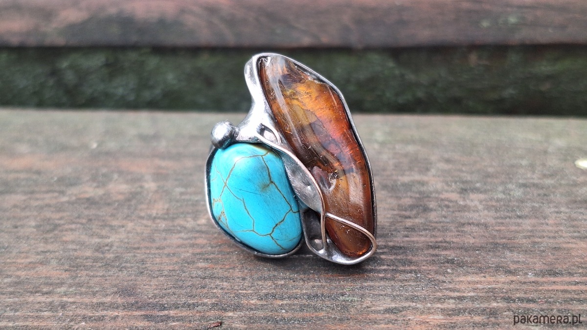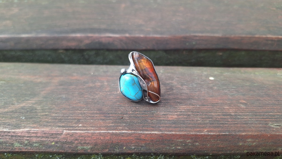 Pierścionek wykonany z miedzi, cyny, howlitu i bursztynu. Wymiary ok. 3 na 2 cm. Regulowany. Nie jest ciężki.