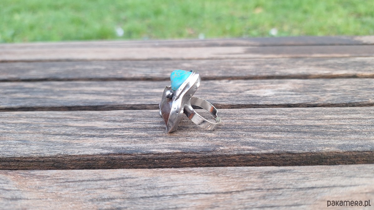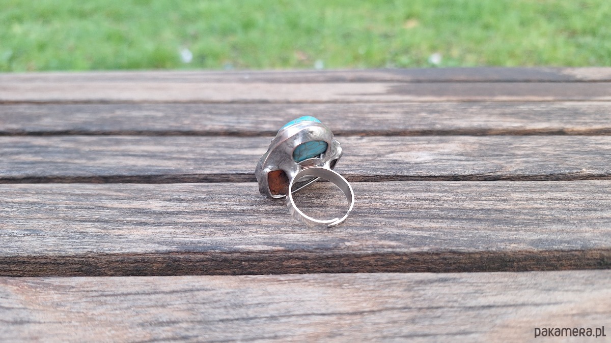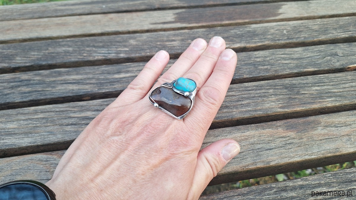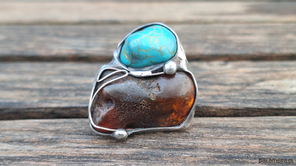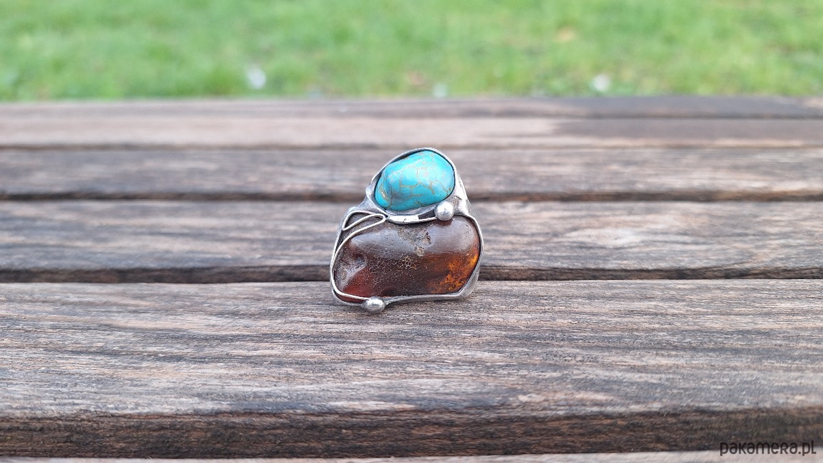 Pierścionek wykonany z miedzi, cyny, howlitu i bursztynu. Wymiary ok. 3 na 3 cm. Regulowany. Nie jest ciężki.