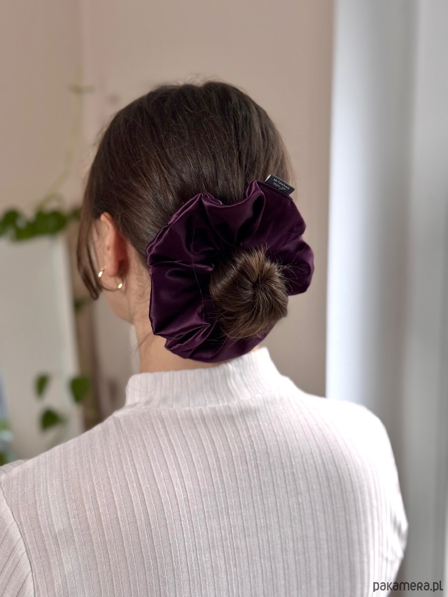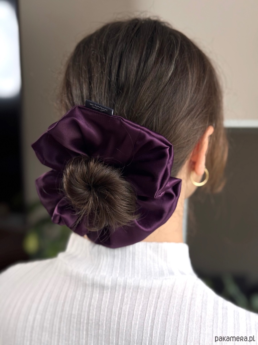 Duża frotka/scrunchie uszyta z wysokiej jakości satyny bawełnianej w kolorze śliwkowym, to stylowy i elegancki dodatek, który doda każdej fryzurze wyjątkowego charakteru.