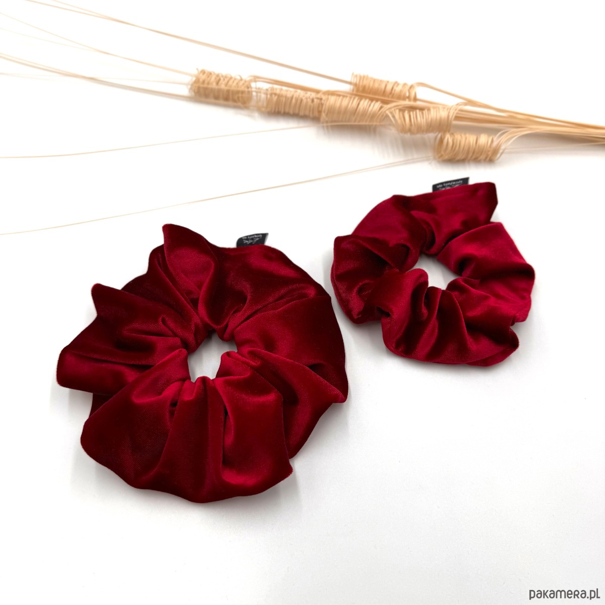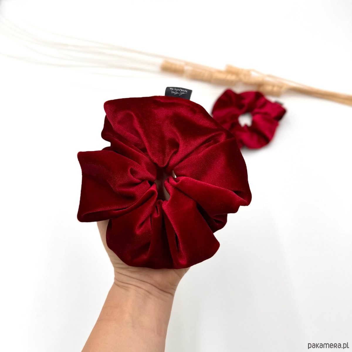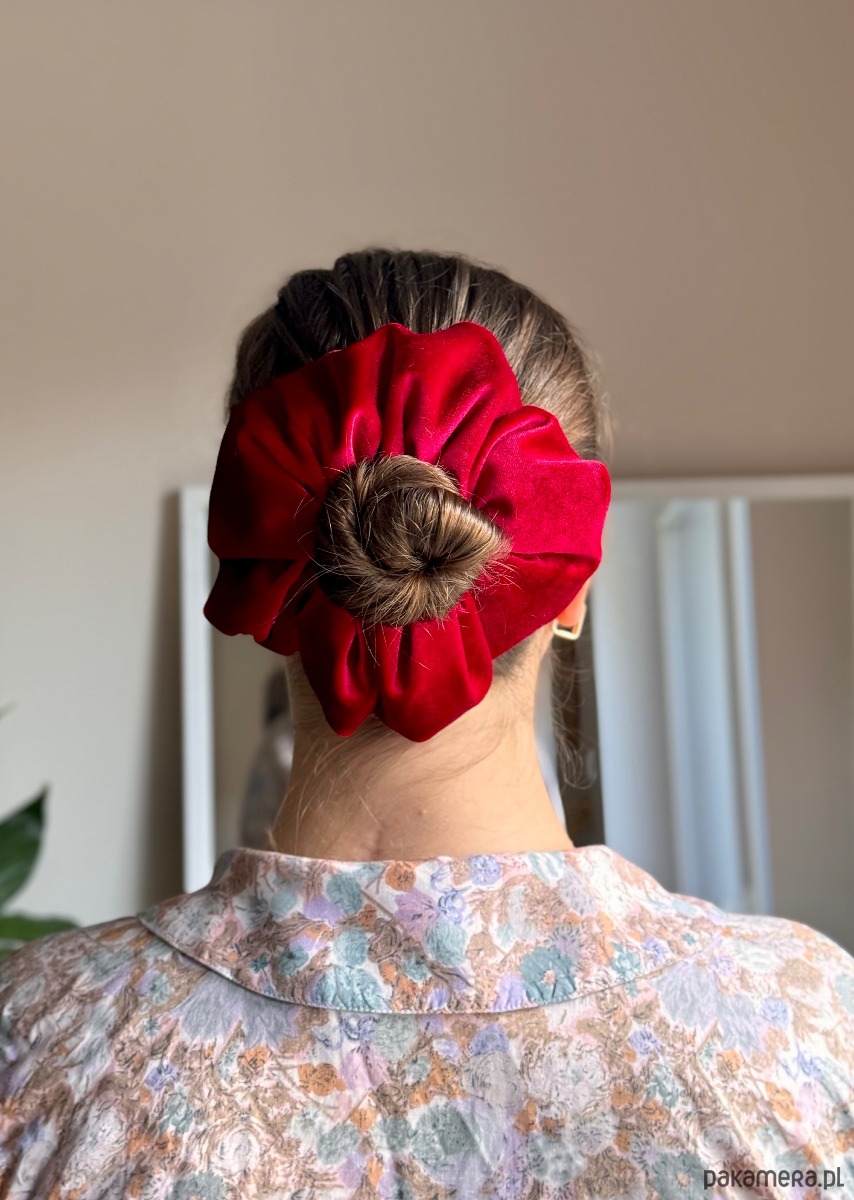 Duża frotka/scrunchie uszyta z wysokiej jakości tkaniny welurowej w intensywnym kolorze czerwieni to stylowy i elegancki dodatek, który nada każdej fryzurze wyjątkowy charakter.