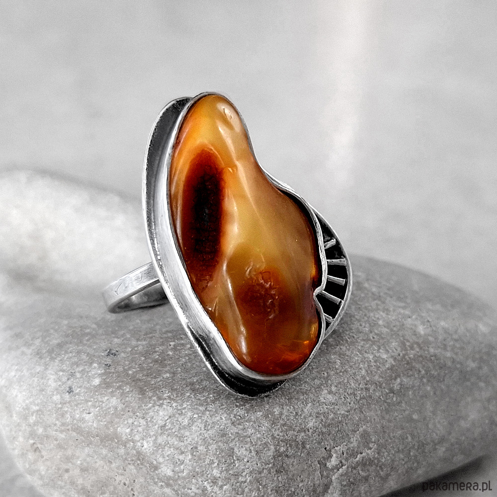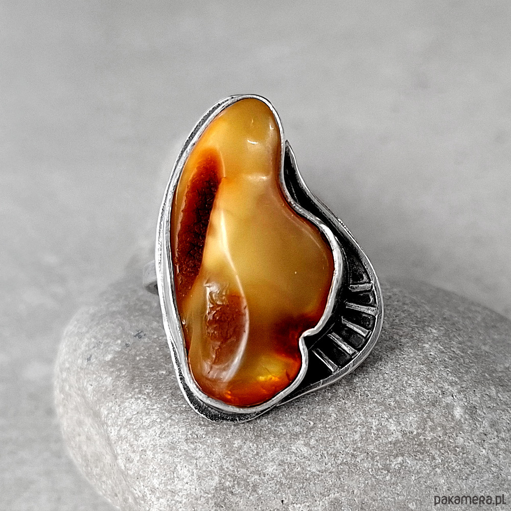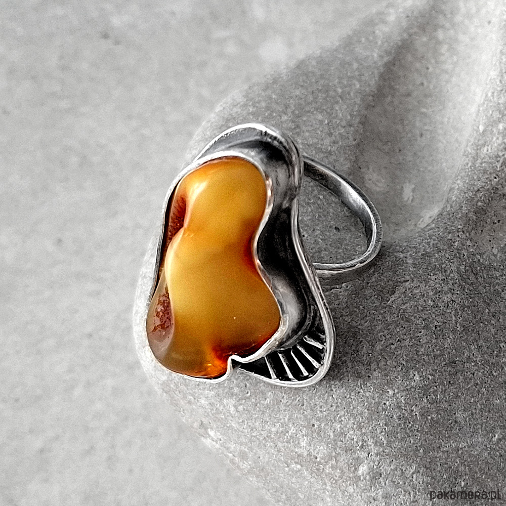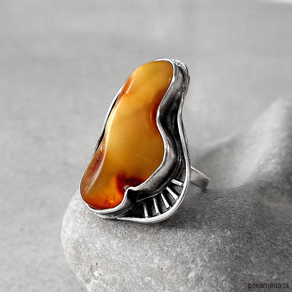 Okazały, wykonany w jednym egzemplarzu, przykuwający wzrok pierścień, wykonany w całości ręcznie ze srebra próby 930 i 999. Ozdobiony naturalnym bursztynem bałtyckim o unikalnej barwie. Wymiary korony pierścionka: ok. 34x22 mm w najszerszym miejscu. Obrączka rozmiar 14. Biżuteria zostanie ozdobnie zapakowana.
