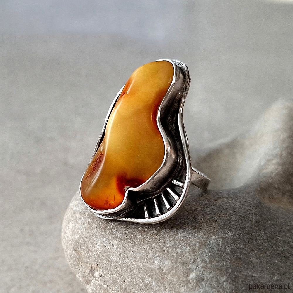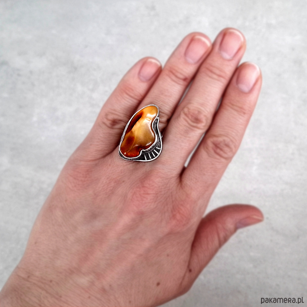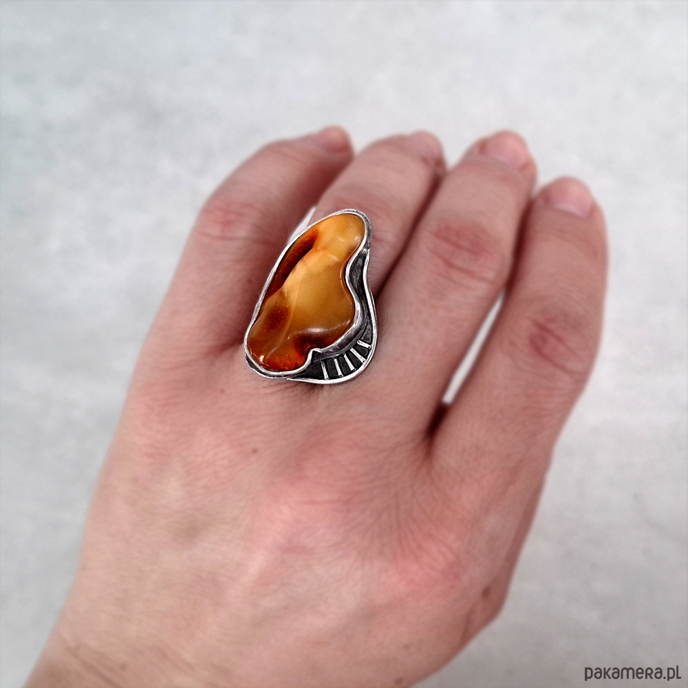 Okazały, przykuwający wzrok pierścień, wykonany w całości ręcznie ze srebra próby 930 i 999. Ozdobiony naturalnym bursztynem bałtyckim o unikalnej barwie. Wymiary korony pierścionka: ok. 34x22 mm w najszerszym miejscu. Obrączka rozmiar 14. Biżuteria zostanie ozdobnie zapakowana.
