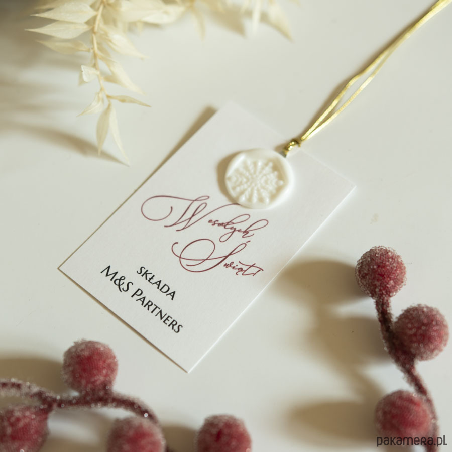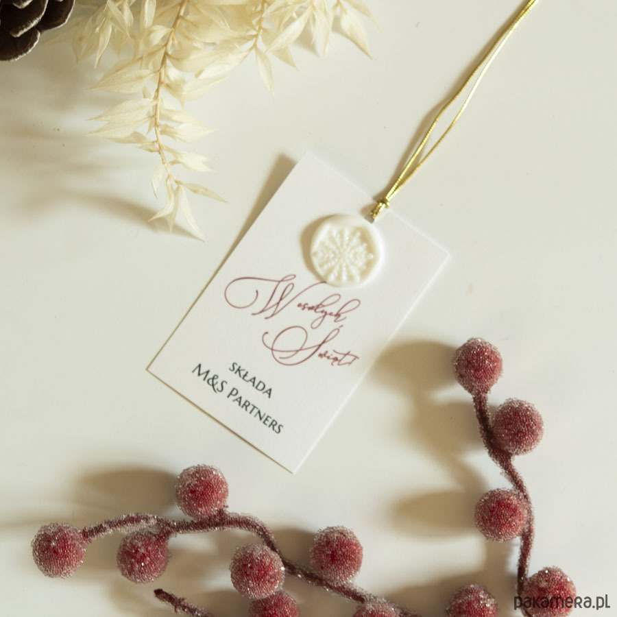 Komplet 10 bilecików do prezentów z białego papieru, zdobionych kaligraficznym napisem i białą pieczęcią ze śnieżynką.