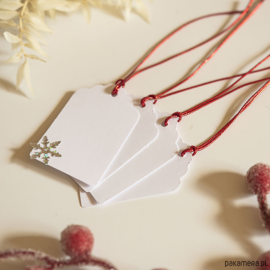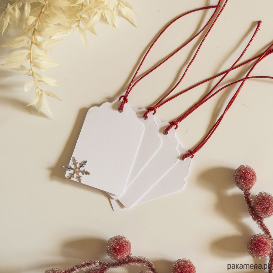 Komplet 10 bilecików do prezentów z białego papieru, zdobionych błyszczącymi śnieżynkami.