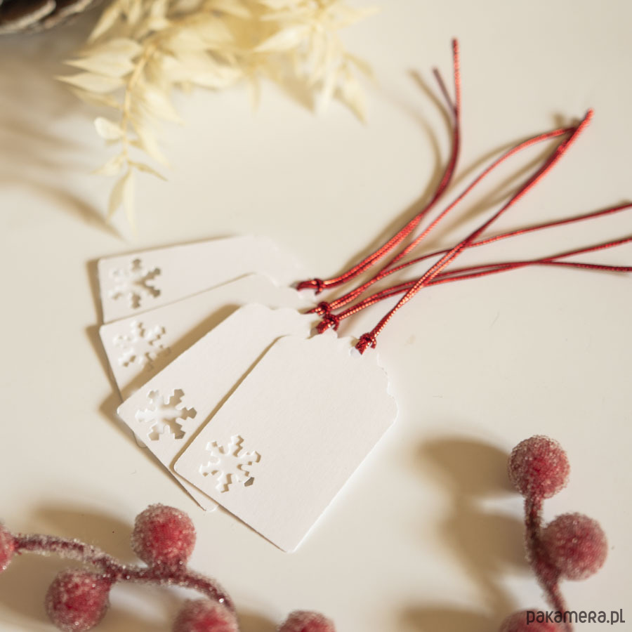 Komplet 10 bilecików do prezentów z białego papieru, zdobionych wycięciem w kształcie śnieżynki.