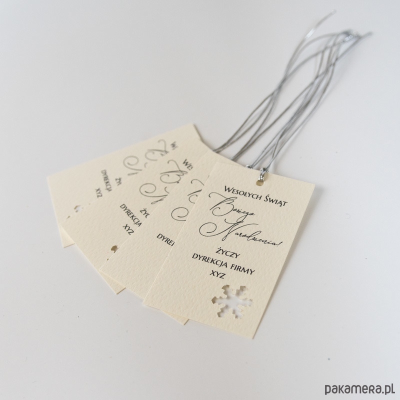 Komplet 12 bilecików do prezentów z brązowego papieru, z napisem "Wesołych Świąt Bożego Narodzenia" oraz logo lub nazwą Twojej firmy. Bileciki zdobione są wycięciem w kształcie śnieżynki (mogą być też bez wycięcia).