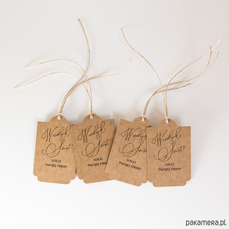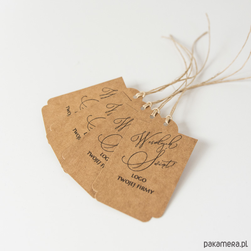 Komplet 12 bilecików do prezentów z brązowego papieru ekologicznego, z napisem "Wesołych Świąt" oraz logo Twojej firmy. Bileciki zdobione są wycięciem na rogach.