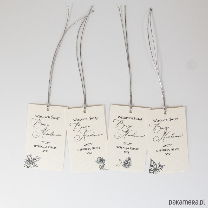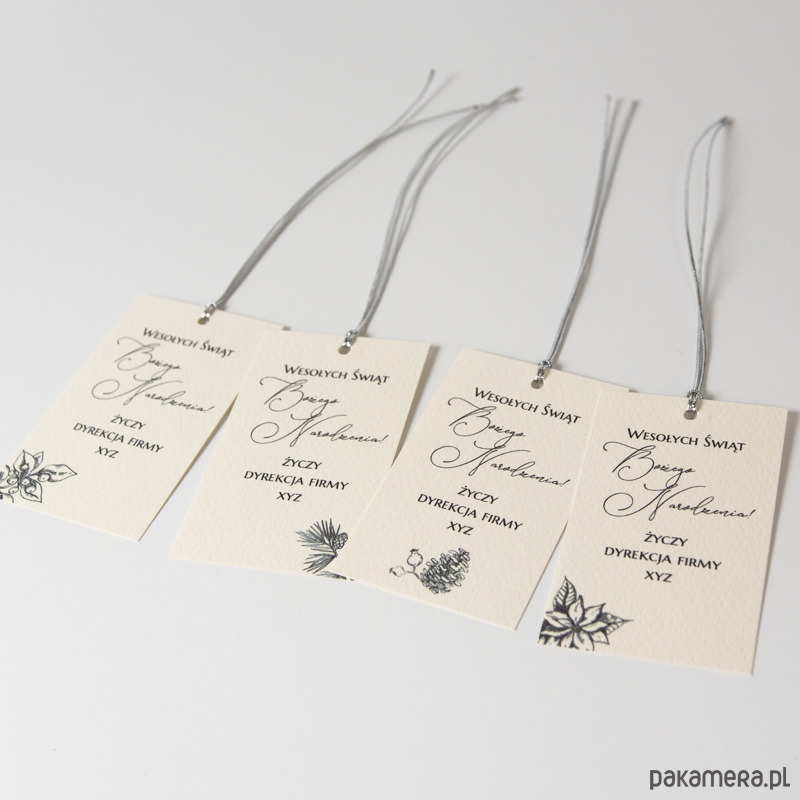 Komplet 12 bilecików do prezentów z kremowego papieru, z napisem "Wesołych Świąt Bożego Narodzenia" oraz logo lub nazwą Twojej firmy. Bileciki zdobione są wydrukiem ręcznie malowanych ilustracji z motywami zimowymi.
