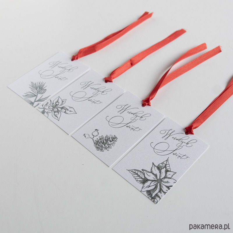Komplet 12 bilecików do prezentów wydrukowanych na białym metalicznym papierze.
