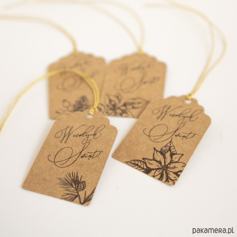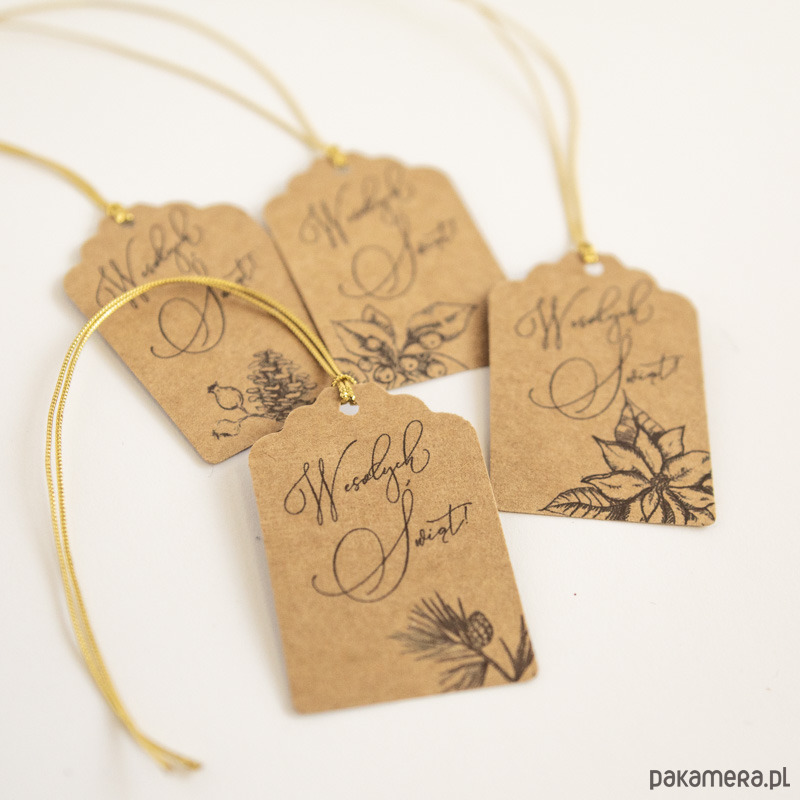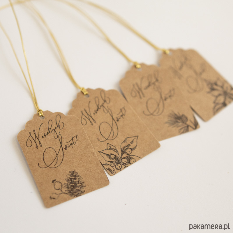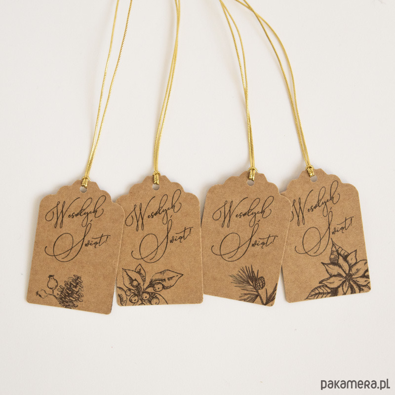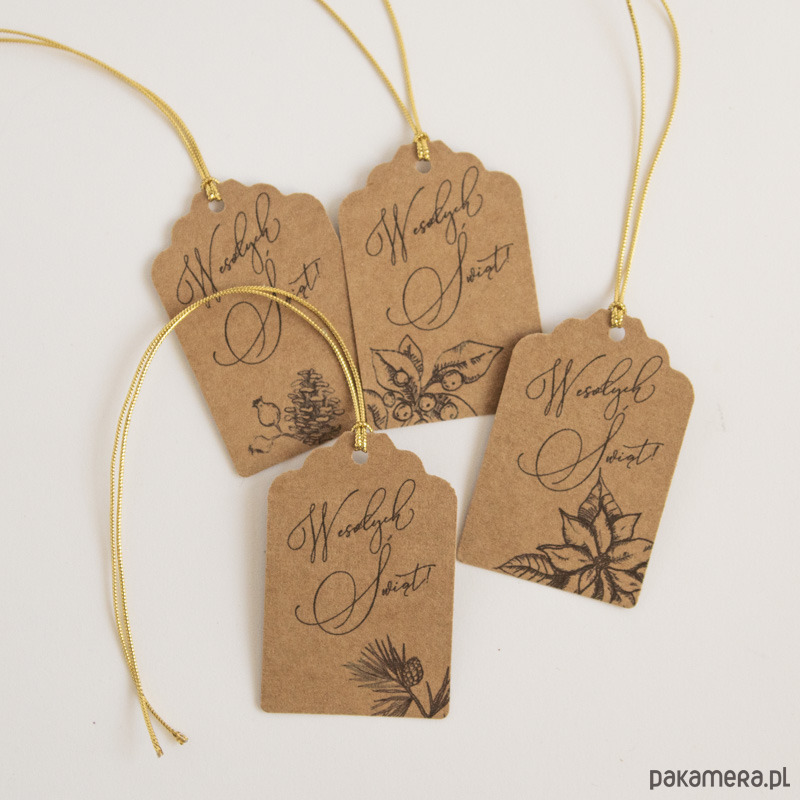 Komplet 12 bilecików do prezentów z brązowego papieru ekologicznego, z napisem "Wesołych Świąt". Bileciki zdobione są wydrukami ręcznie rysowanych motywów świątecznych (4 różne).