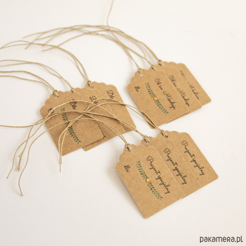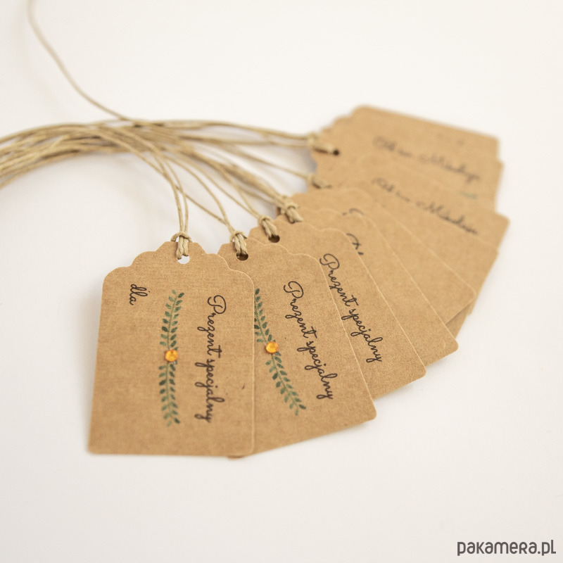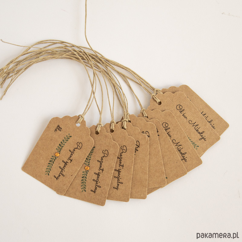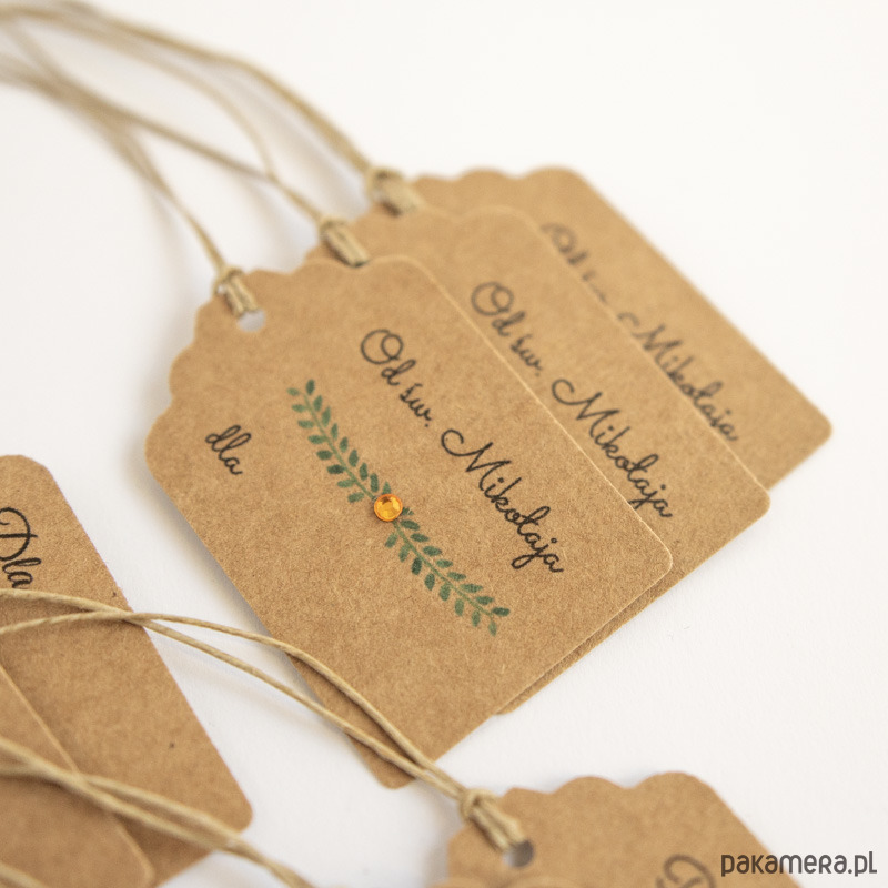 Komplet 12 bilecików do prezentów z brązowego papieru ekologicznego, z napisem "Prezent specjalny dla..." oraz "Od św. Mikołaja dla...". Bileciki zdobione są wydrukiem ręcznie malowanych gałązek i złotym kryształkiem.