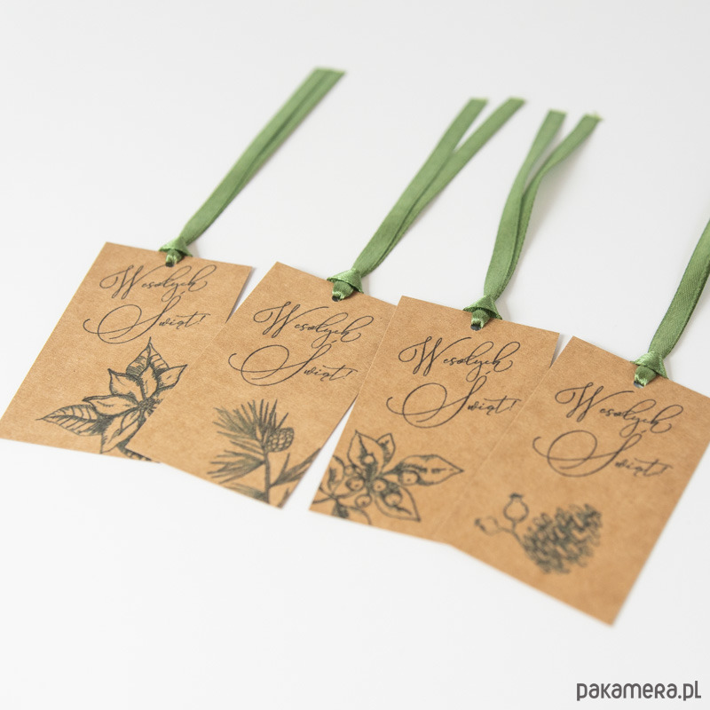 Komplet 12 bilecików do prezentów z brązowego papieru, z napisem "Wesołych Świąt!".