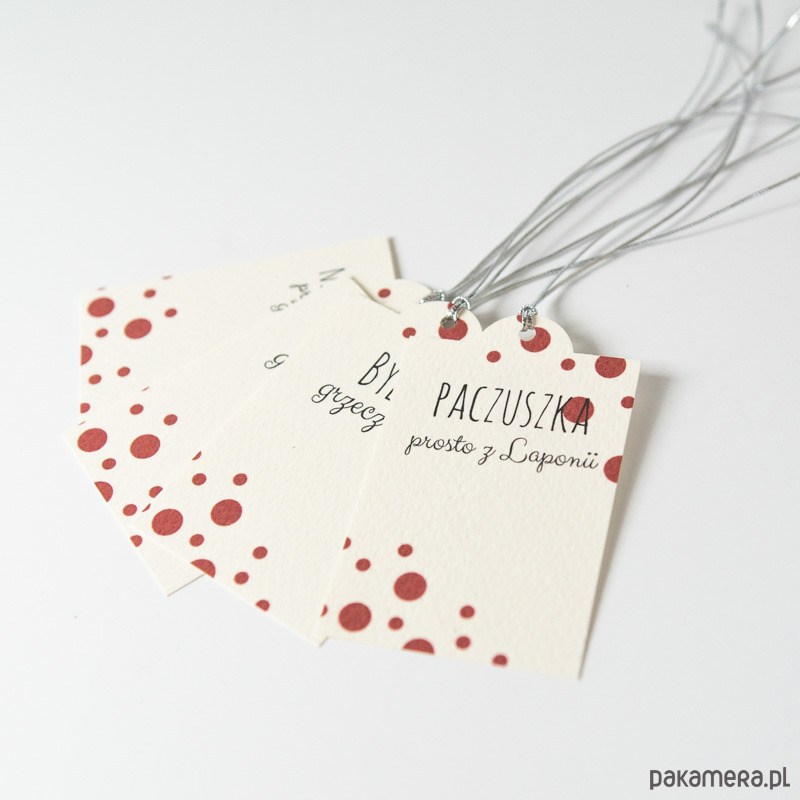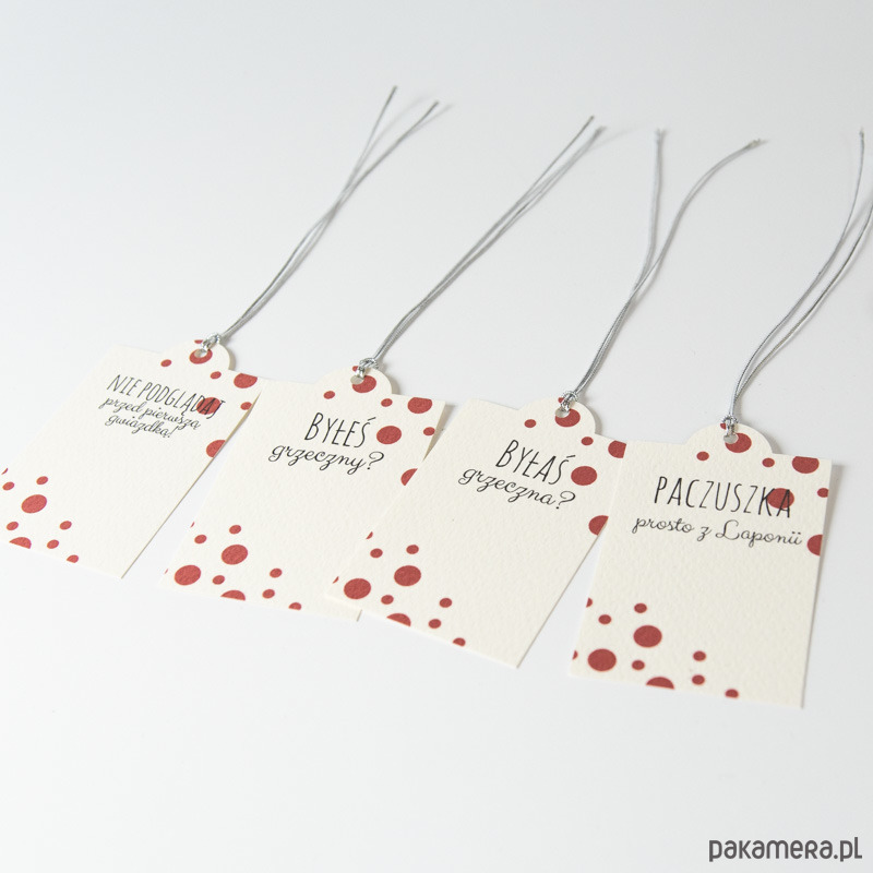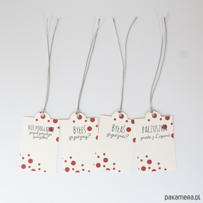 Komplet 8 bilecików do prezentów z kremowego papieru, z napisami "Nie podglądaj przed pierwszą gwiazdką!", "Byłeś grzeczny?", "Byłaś grzeczna?" oraz "Paczuszka prosto z Laponii".