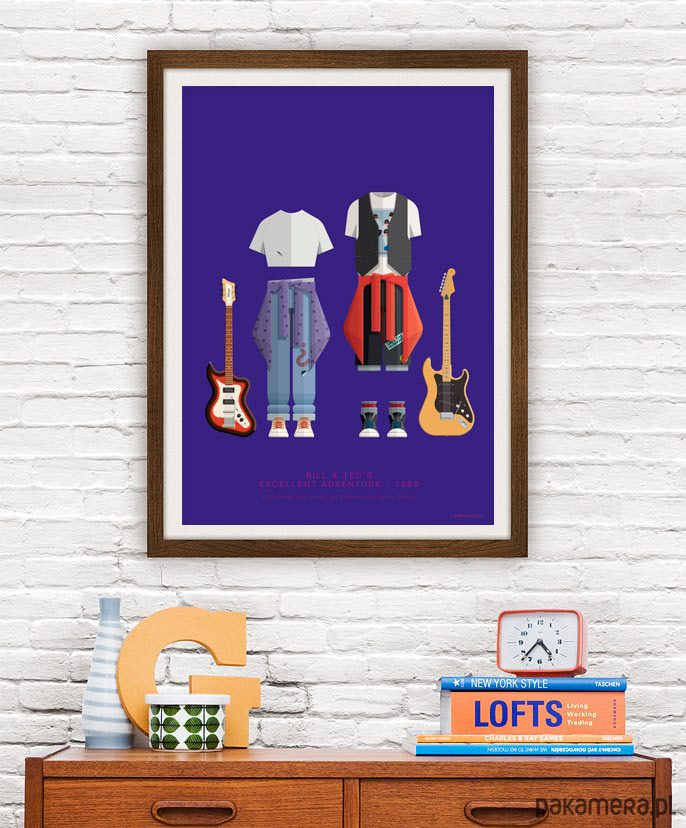 Plakat inspirowany filmem Bill & Ted, reż. Stephen Herek przedstawiający kostiumy dwóch głównych, zwariowanych postaci z nieodłącznymi gitarami. Idealna dekoracja dla każdego, kto tęskni za szalonymi przygodami i ceni muzykę ponad wszystko.