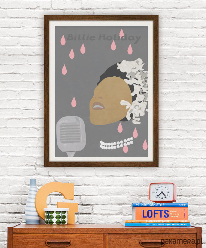 Plakat inspirowany artystką jazzową - Billie Holiday. Przedstawia śpiewaczkę podczas wykonywania utworu z białą gardenią we włosach, która stała się jej znakiem rozpoznawczym.