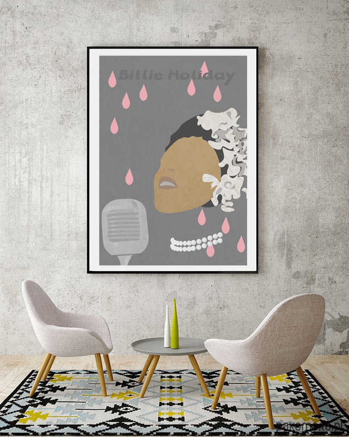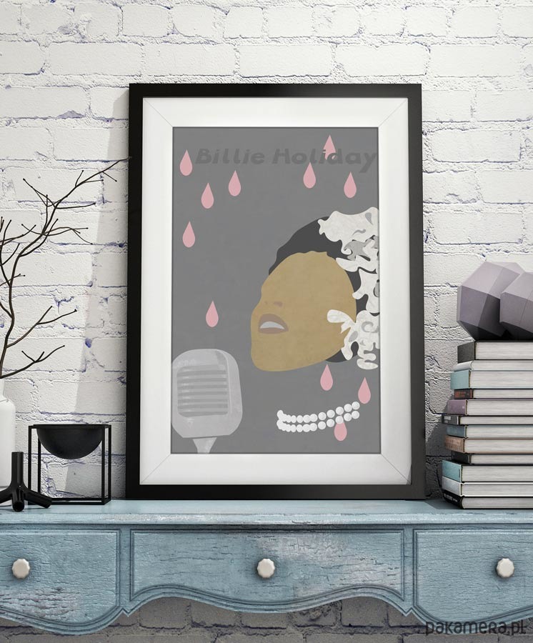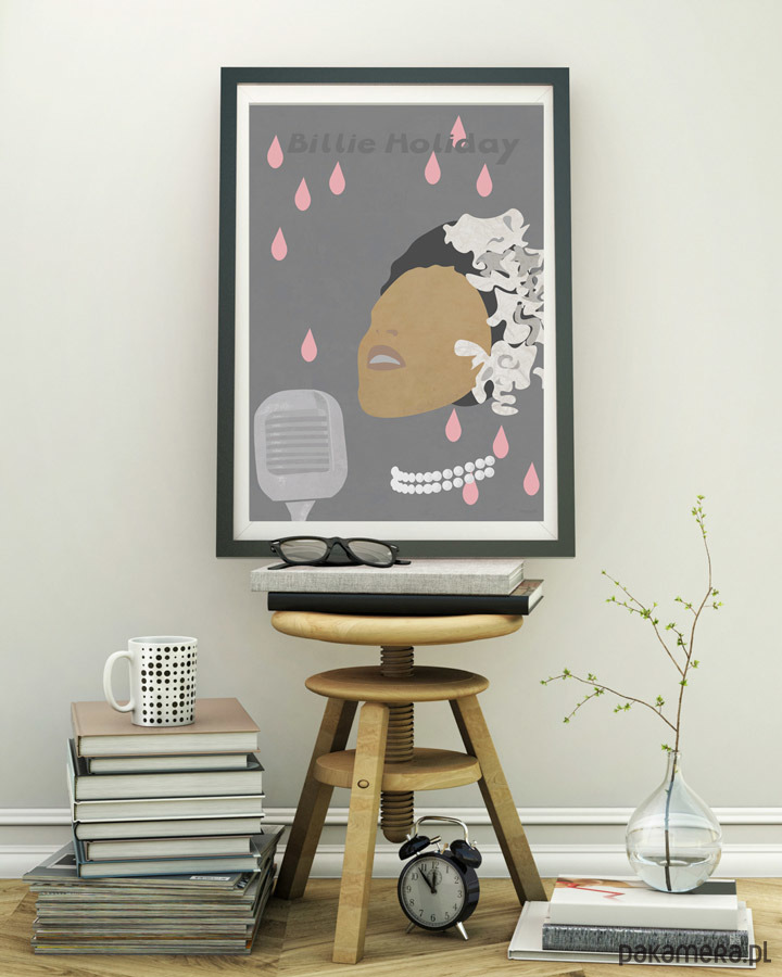 Plakat inspirowany artystką jazzową - Billie Holiday. Przedstawia śpiewaczkę podczas wykonywania utworu z białą gardenią we włosach, która stała się jej znakiem rozpoznawczym.