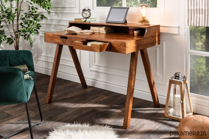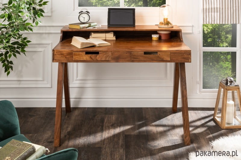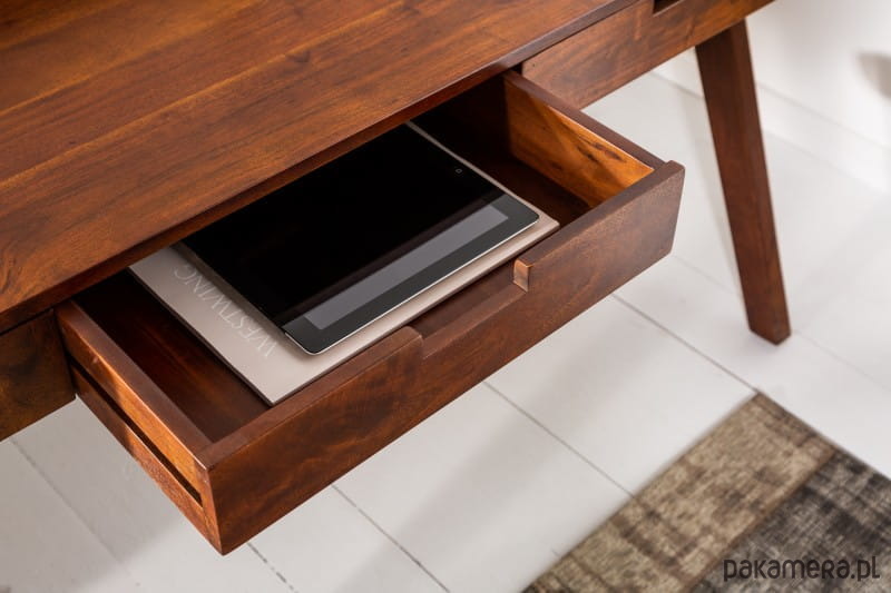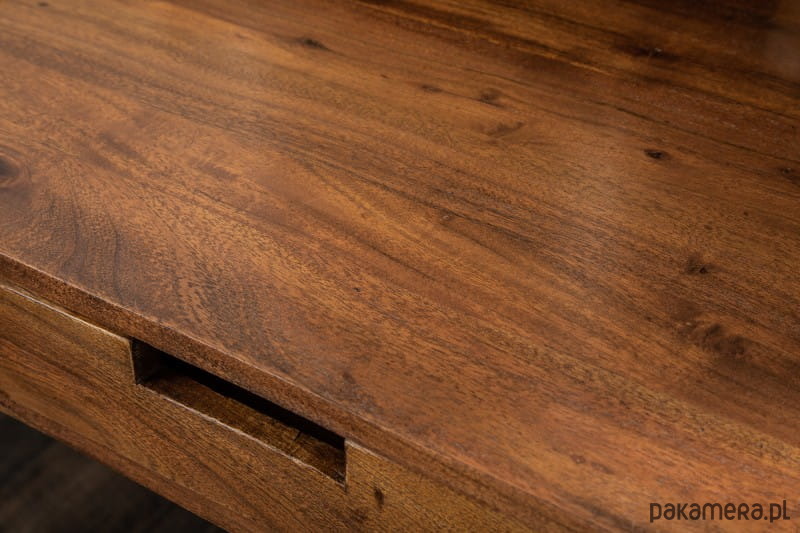Stylowy sekretarzyk, konsola drewniana Moon to dodatek, który zadowoli nawet najbardziej wymagających użytkowników. Wykonany z drewna akacjowego, charakteryzuje się obecnością dwóch szuflad oraz pojedynczej półki. Ustawiony w gabinecie, pracowni czy też salonie z pewnością przypadnie do gustu wszystkim gościom.