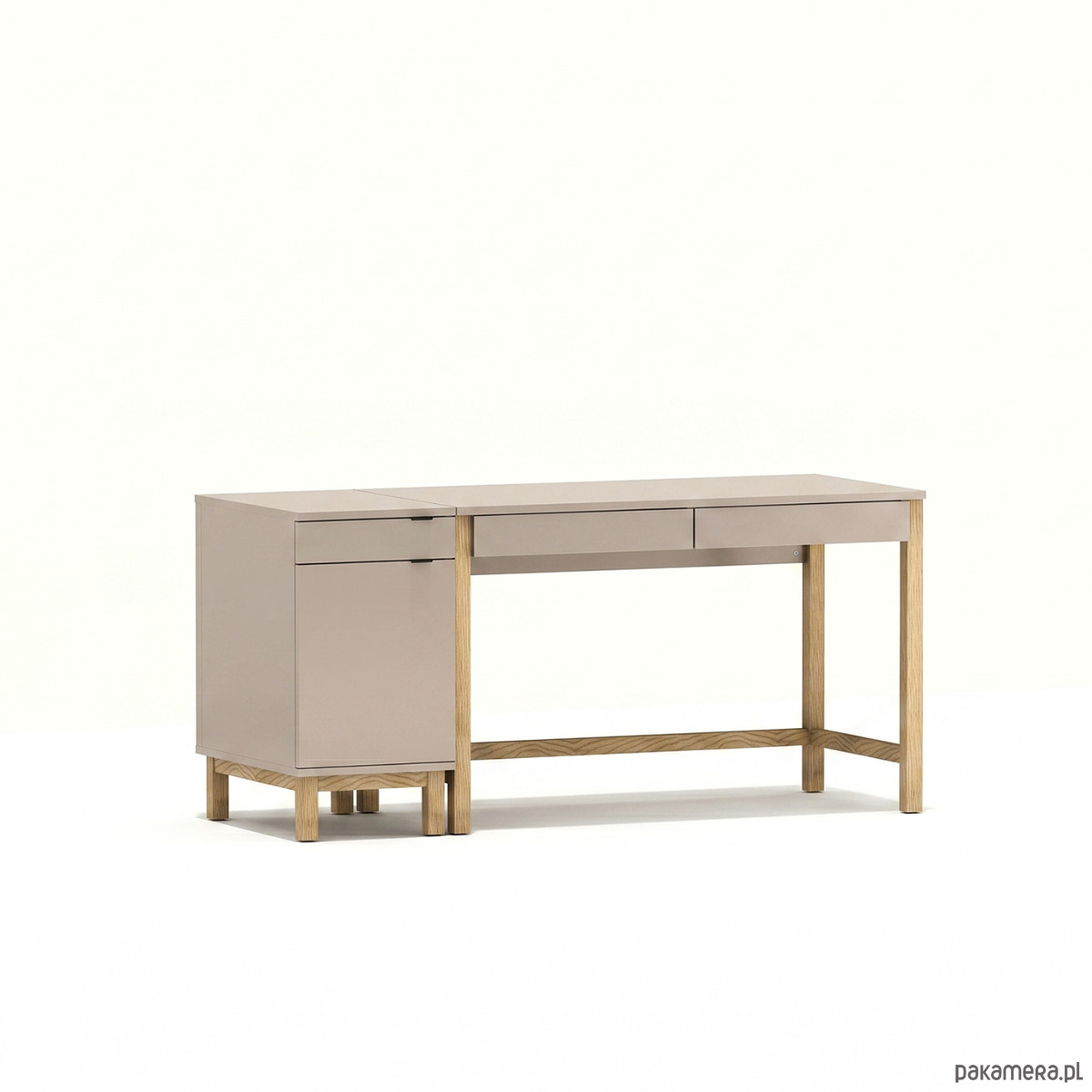 - dwie szuflady pod blatem biurka, a w dostawce szuflada i zamykana szafka