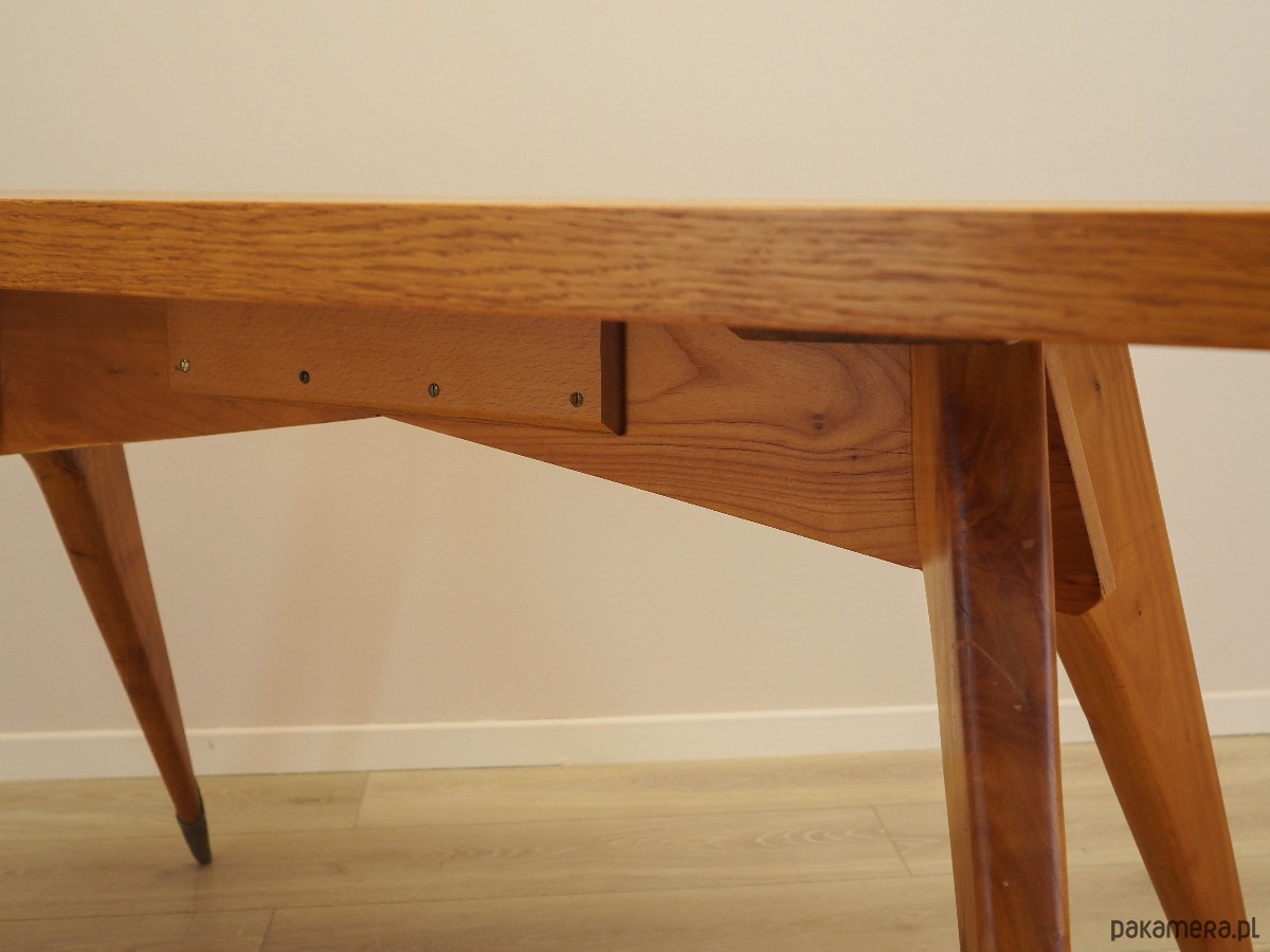 Konstrukcja oraz blat pokryte są fornirem dębowym. Nogi wykonane z litego drewna, perfekcyjnie wkomponowane w konstrukcję biurka. Powierzchnia po odświeżeniu.