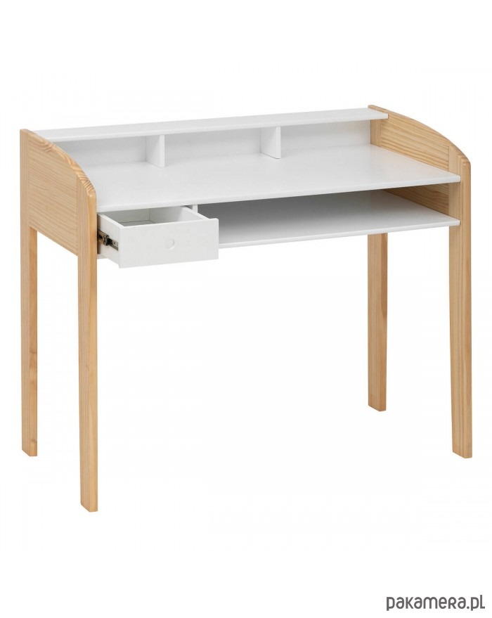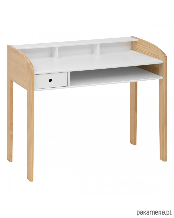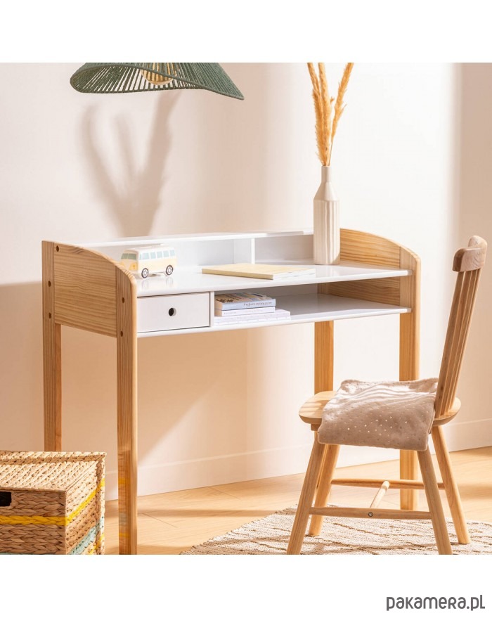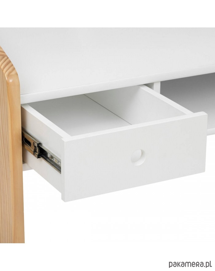 Biurko do pokoju dziecięcego wykonane z płyty meblowej z wodoodporną powłoką i nóżkami z recyklinowanego drewna. Ergonomiczny design nawiązuje do stylu skandynawskiego. Prosta forma i zaokrąglone linie wprowadzają do wnętrza ciepło i harmonię. Ta minimalistyczna konsola zbudowana jest z wielu skrytek i schowków. Niewielka szuflada pod białym blatem i stelaż z przegródkami pozwala umieścić akcesoria biurowe np. przybory do pisania czy notesy, zeszyty itp.