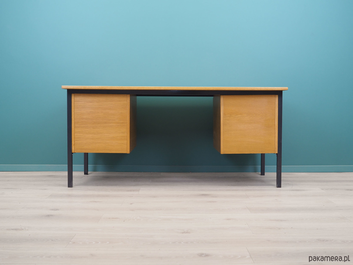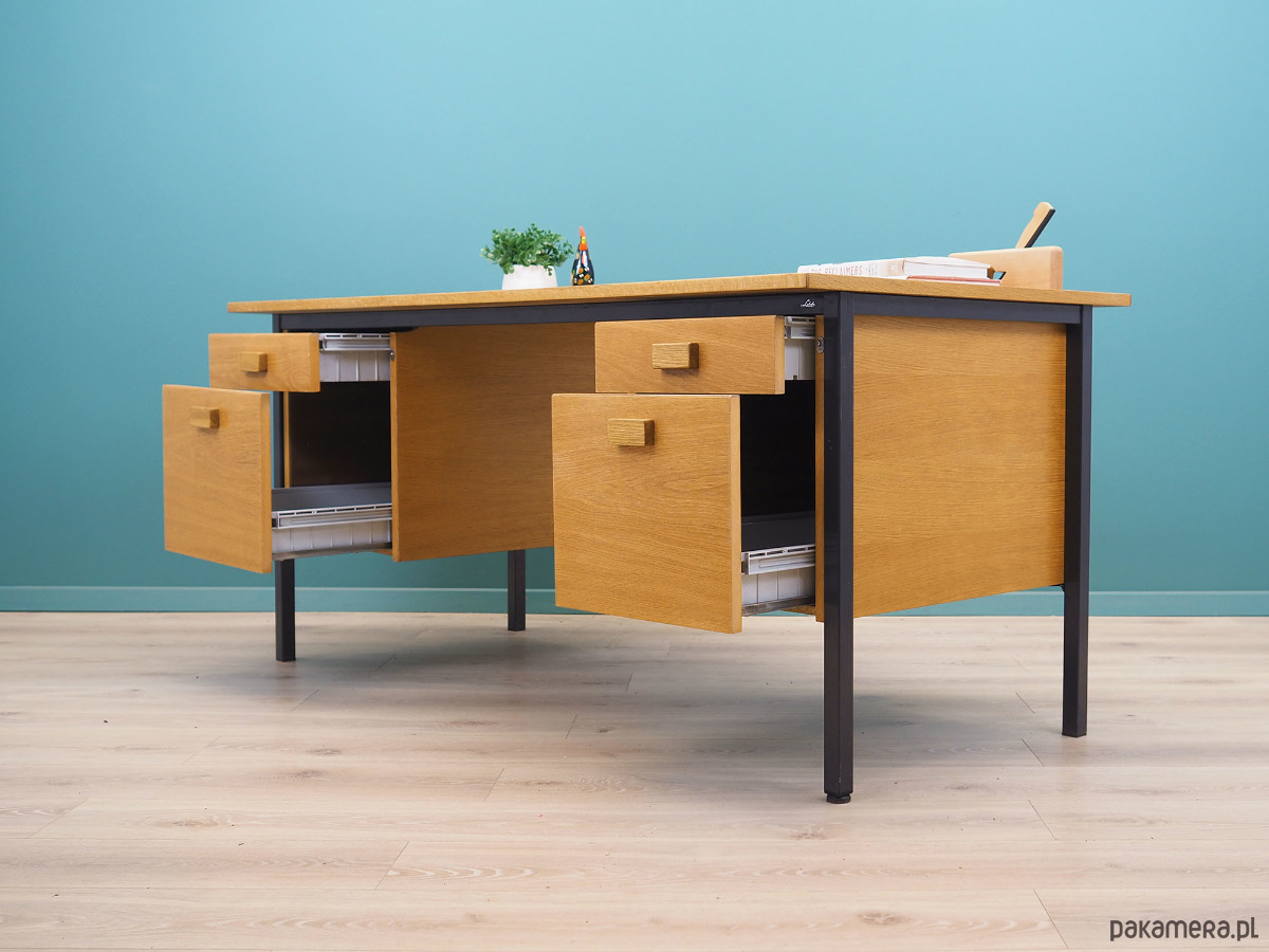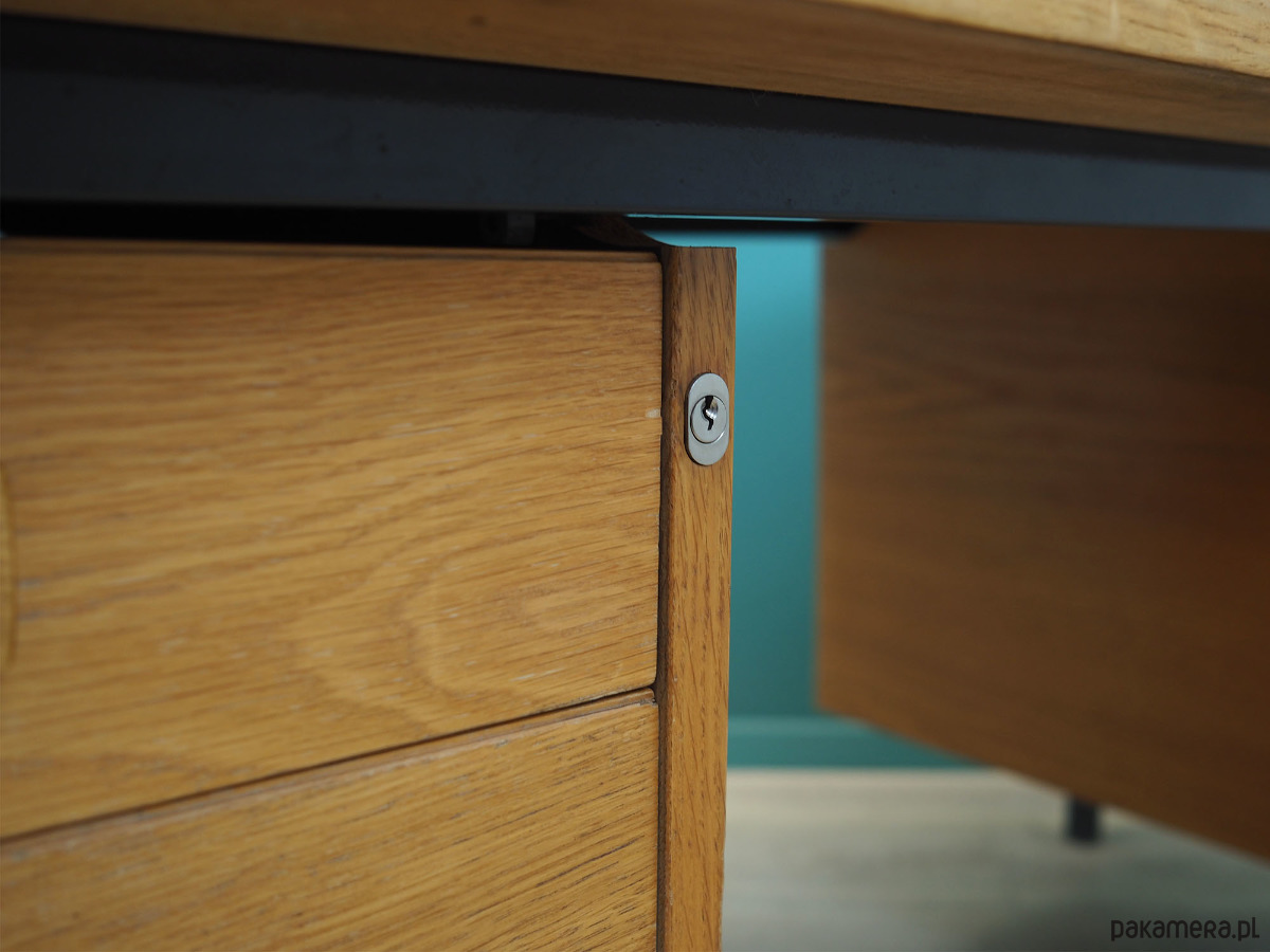Blat pokryty jest fornirem jesionowym. Nogi wykonane z metalu, uchwyty z litego drewna. Powierzchnia po odświeżeniu. Od frontu biurko posiada cztery praktyczne szuflady. Brak klucza w zestawie.