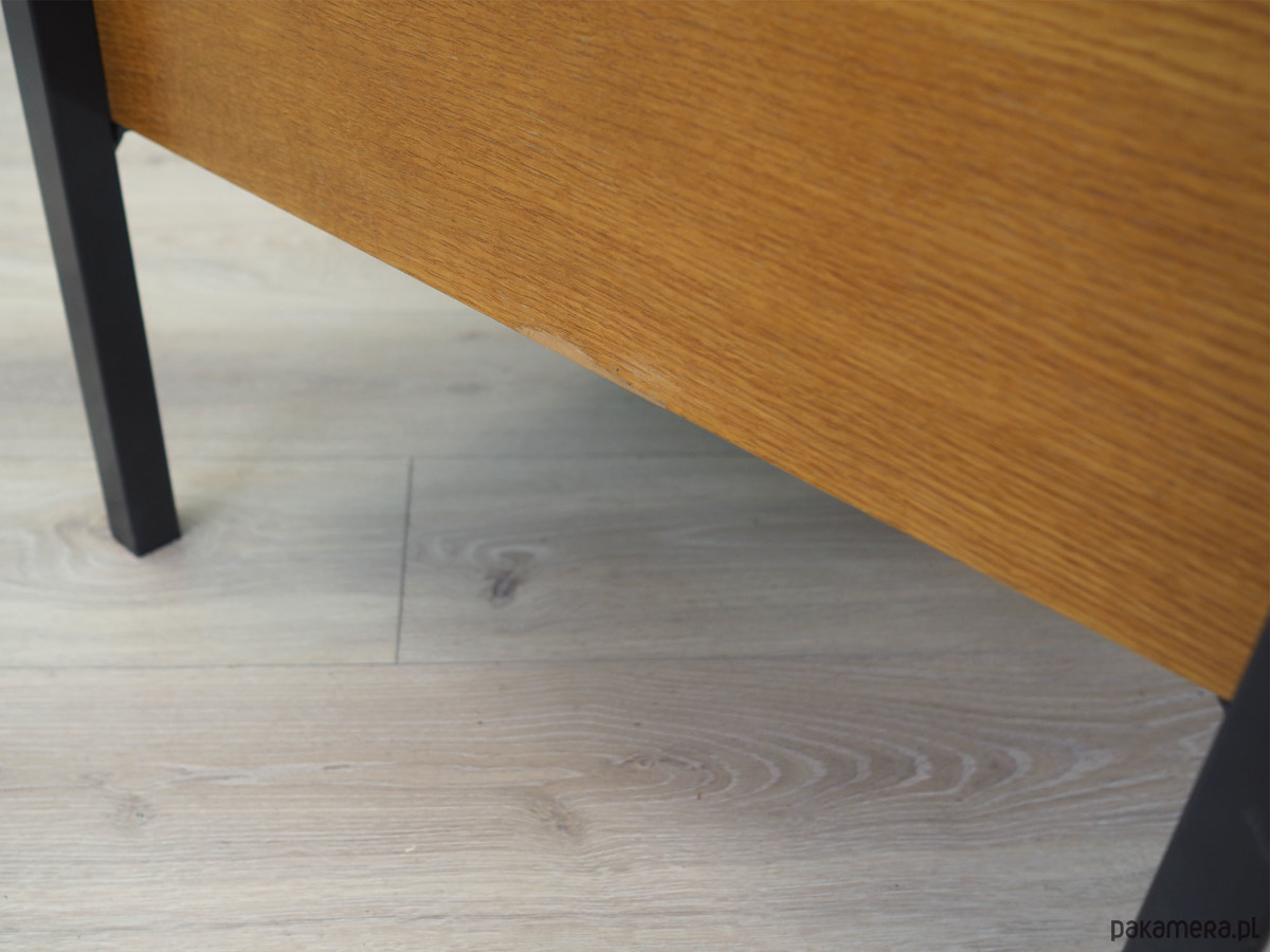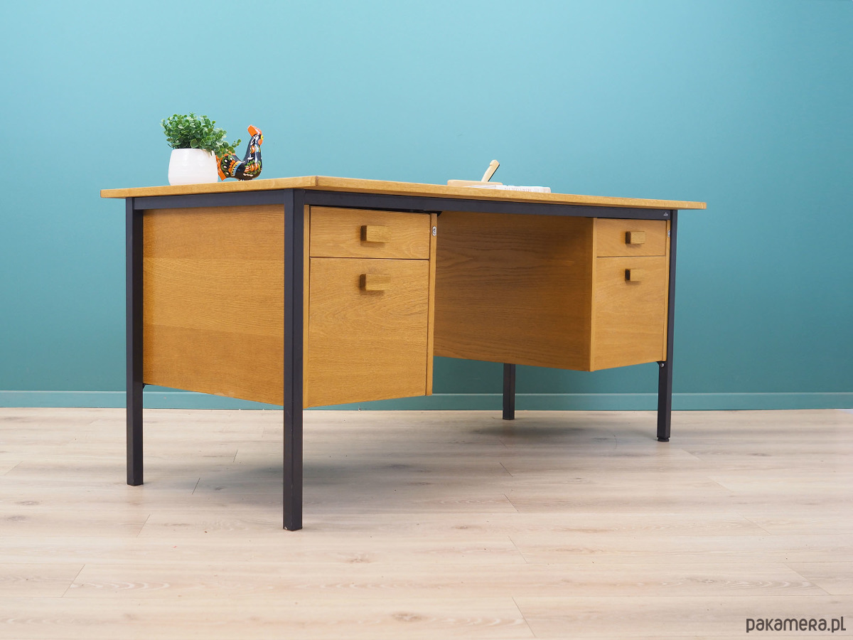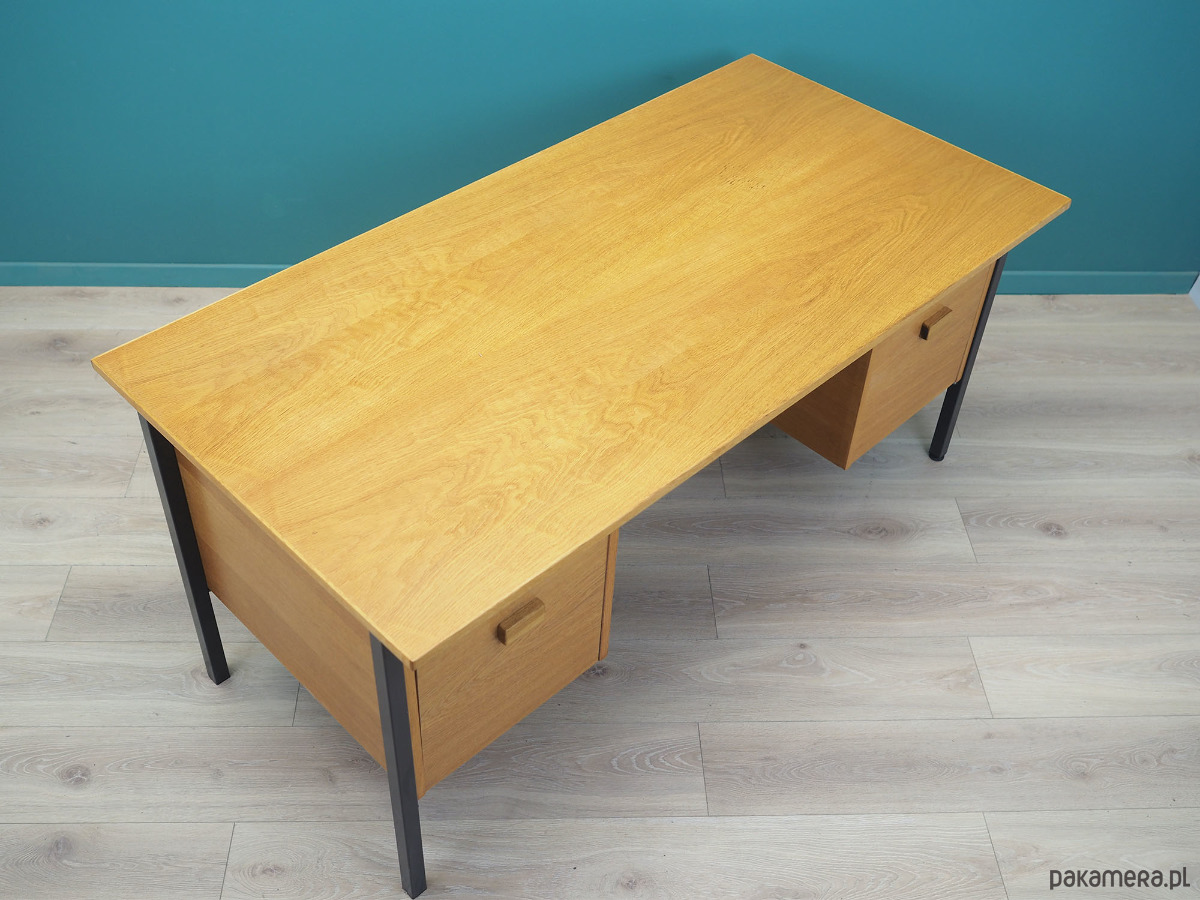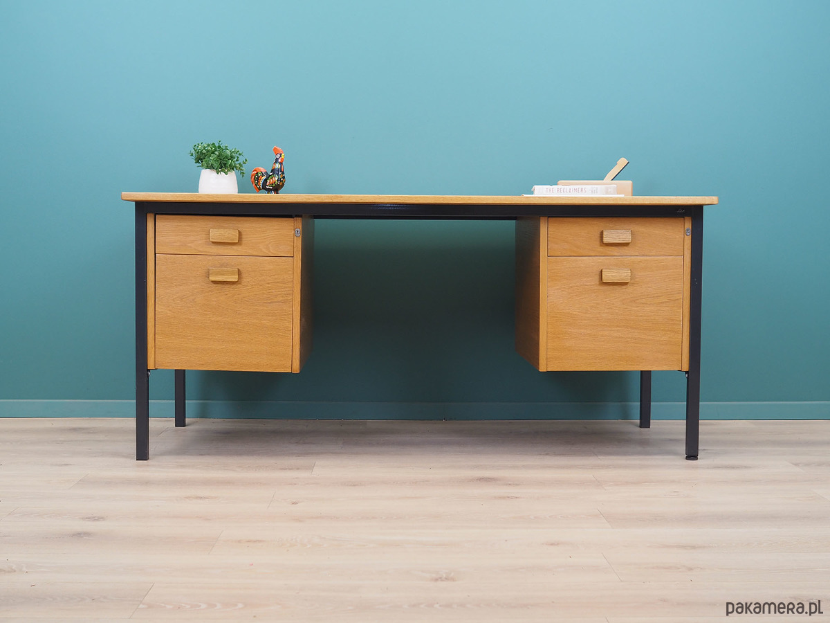 Blat pokryty jest fornirem jesionowym. Nogi wykonane z metalu, uchwyty z litego drewna. Powierzchnia po odświeżeniu. Od frontu biurko posiada cztery praktyczne szuflady. Brak klucza w zestawie.