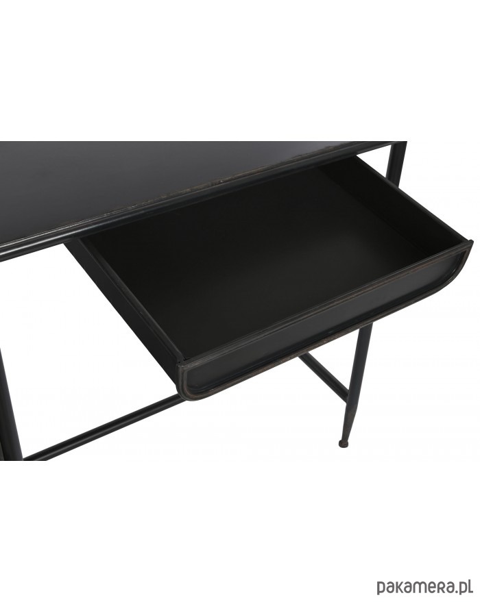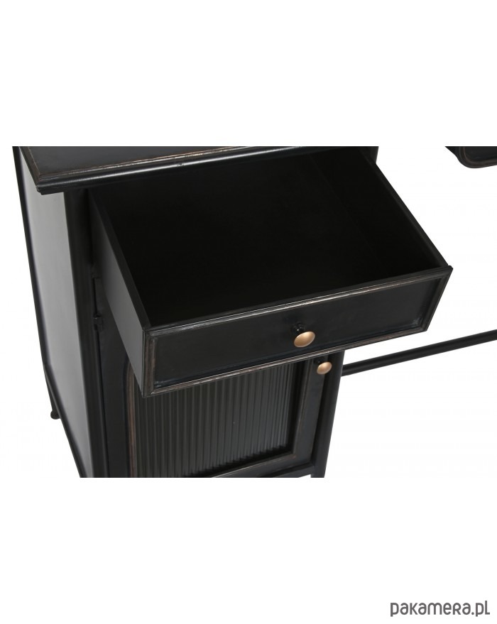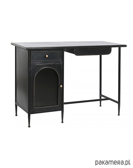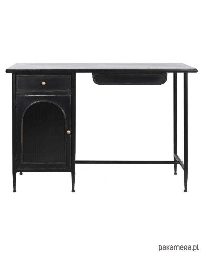 Bardzo ciekawe metalowe biurko. Wykonane z metalu. W kolorze antycznej czerni. Celowo postarzane. Posiada przeszklone, prążkowane drzwi. Posiada także szuflady. Uchwyty złote.