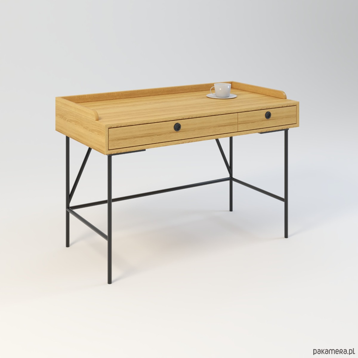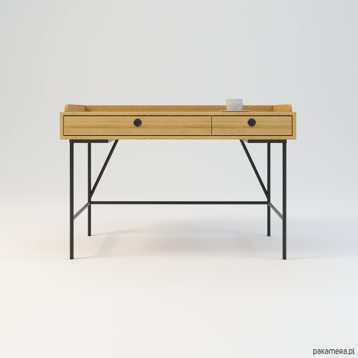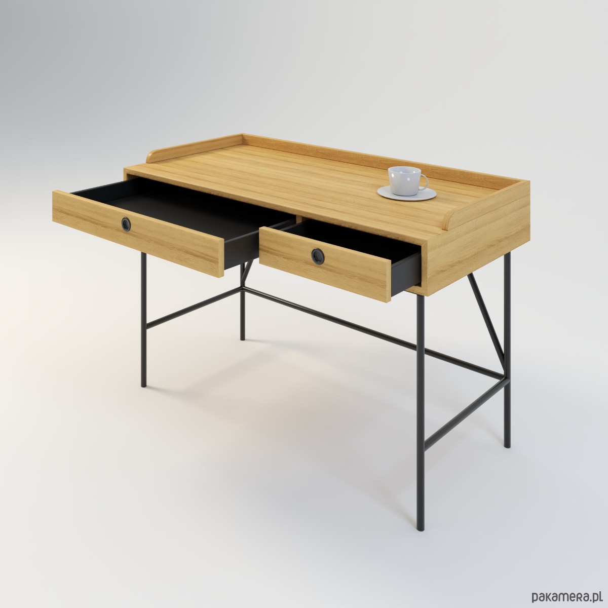 Biurko w stylu minimalistycznym. Swoim wzornictwem nawiązuje do stylu Bauhaus. Posiada 2 funkcjonalne szuflady. W całości wykonane z płyty drewnopochodnej powlekanej naturalnym fornirem dębowym.