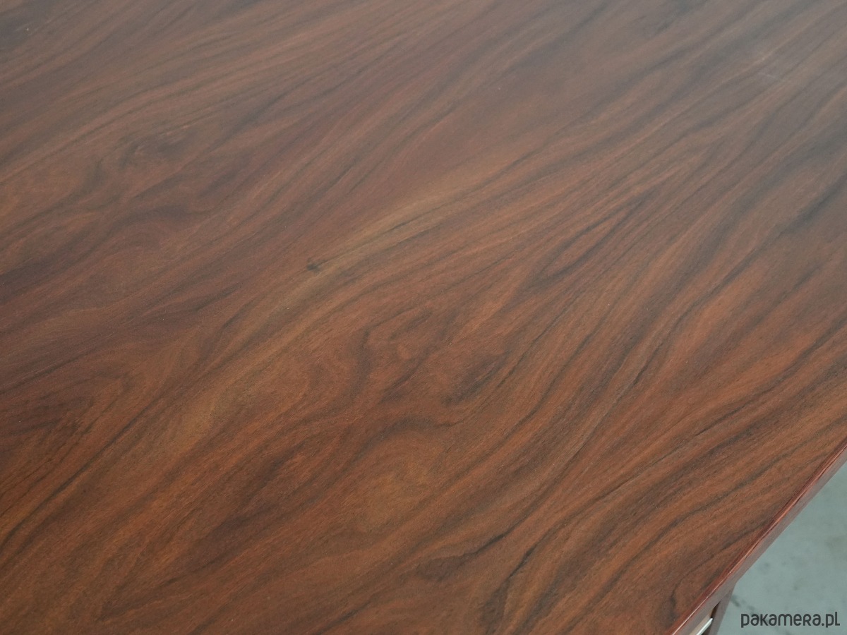 Konstrukcja oraz blat pokryte są fornirem palisandrowym. Nogi wykonane z litego drewna, perfekcyjnie wkomponowane w konstrukcję biurka. Powierzchnia po odświeżeniu. Od frontu biurko posiada pięć pojemnych szuflad.