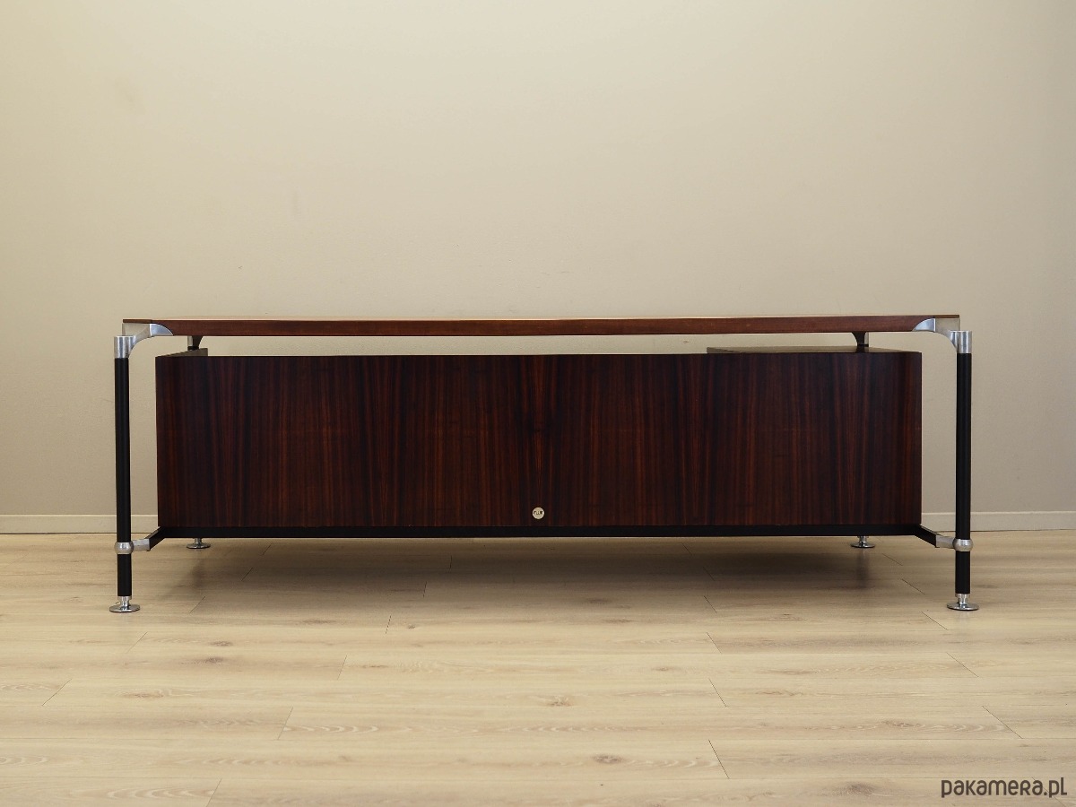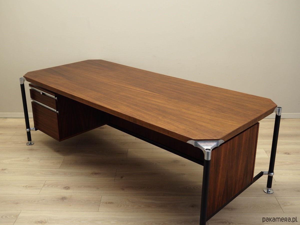 Konstrukcja oraz blat zostały pokryte fornirem palisandrowym. Nogi wykonane z metalu, perfekcyjnie wkomponowane w konstrukcję biurka. Powierzchnia po odświeżeniu. Od frontu biurko posiada dwie praktyczne szuflady. Brak klucza w zestawie.