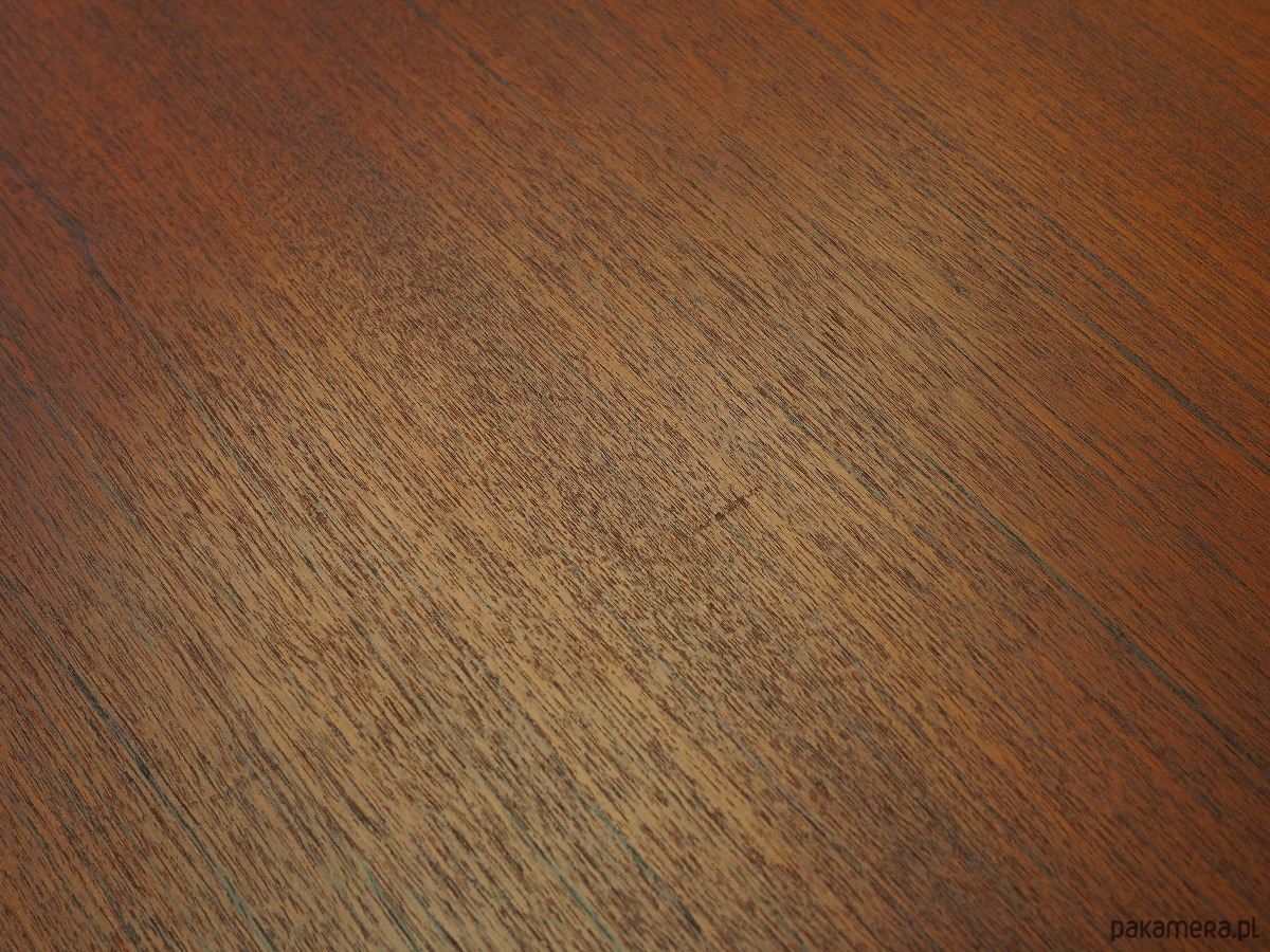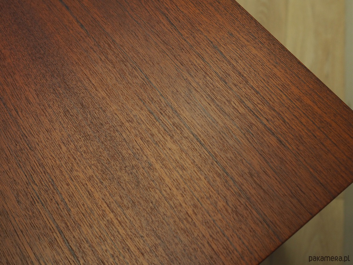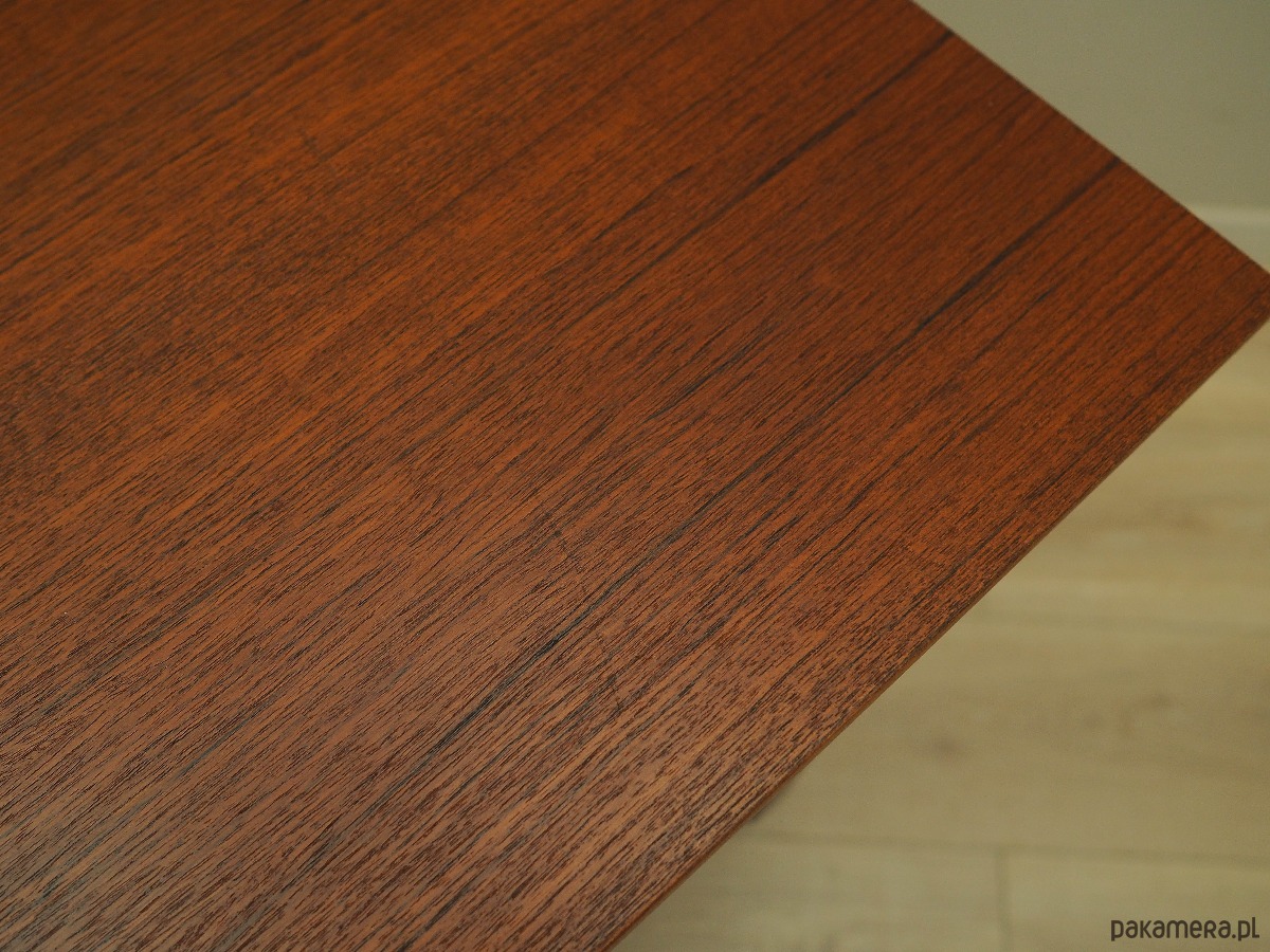 Konstrukcja oraz blat pokryte są fornirem tekowym. Nogi wykonane z litego drewna, perfekcyjnie wkomponowane w konstrukcję biurka. Powierzchnia po odświeżeniu. Od frontu biurko posiada trzy pojemne szuflady.