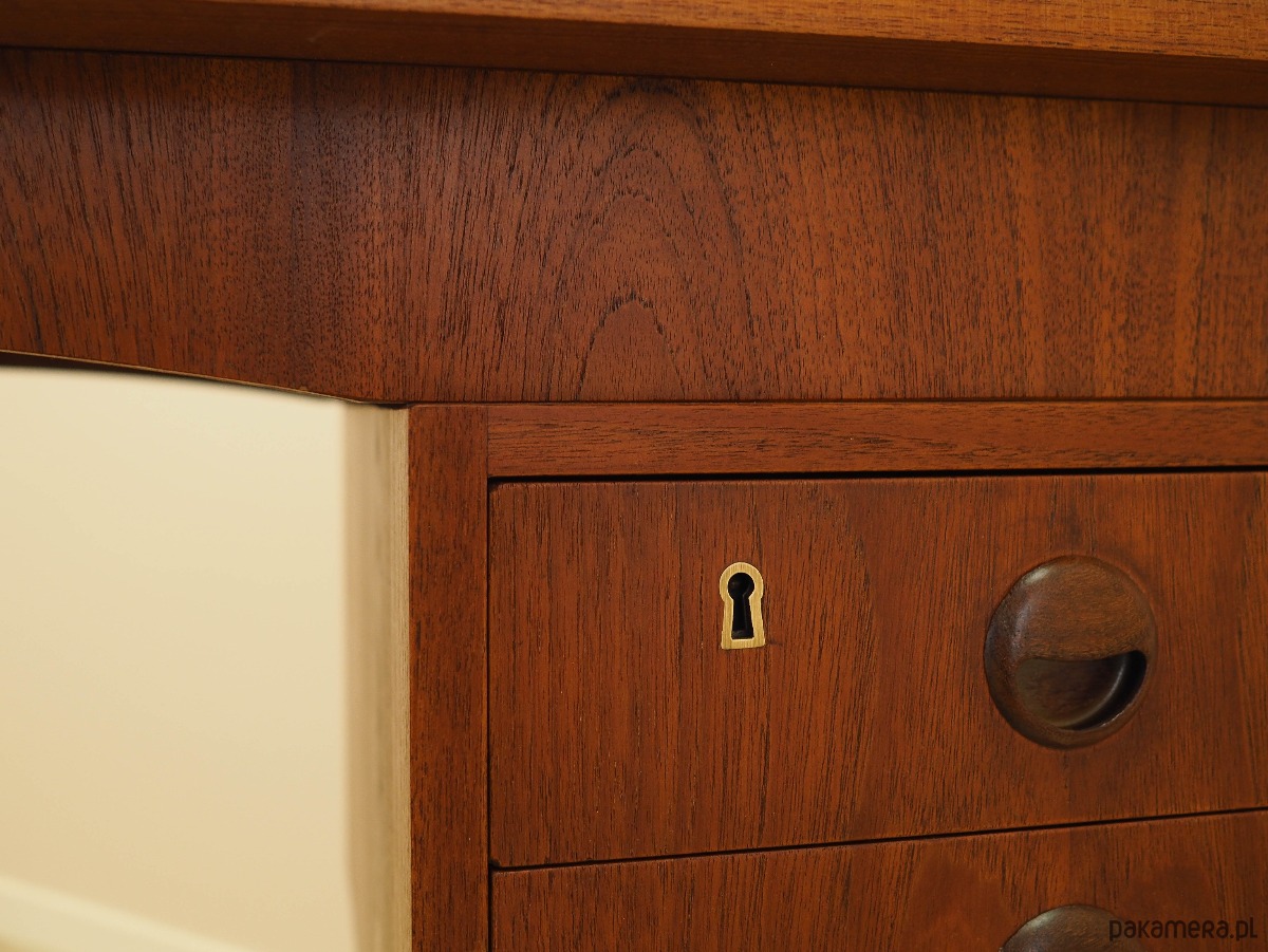 Konstrukcja oraz blat pokryte są fornirem tekowym. Nogi wykonane z litego drewna, perfekcyjnie wkomponowane w konstrukcję biurka. Powierzchnia po odświeżeniu. Od frontu biurko posiada sześć praktycznych szuflad. Z tyłu mebla znajdują się dwie pojemne półki. Brak klucza w zestawie.