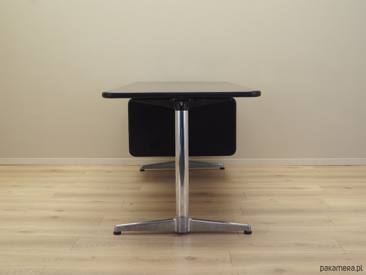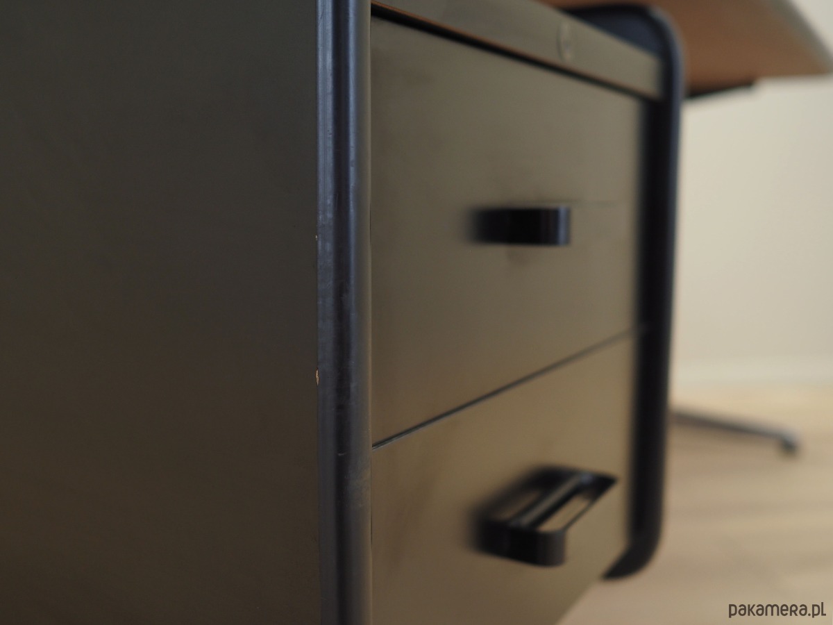 Konstrukcja drewniana pokryta laminatem w kolorze czarnym. Nogi wykonane z metalu, perfekcyjnie wkomponowane w konstrukcję biurka. Uchwyty wykonane z tworzywa sztucznego. Powierzchnia po odświeżeniu. Od frontu biurko posiada dwie praktyczne szuflady. Dodatkowym atutem jest możliwość swobodnego ułożenia skrzyni zarówno z lewej, jak i z prawej strony.