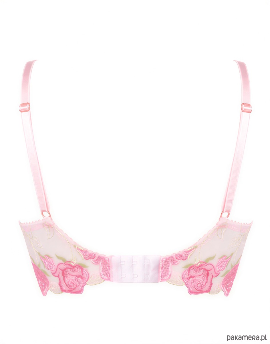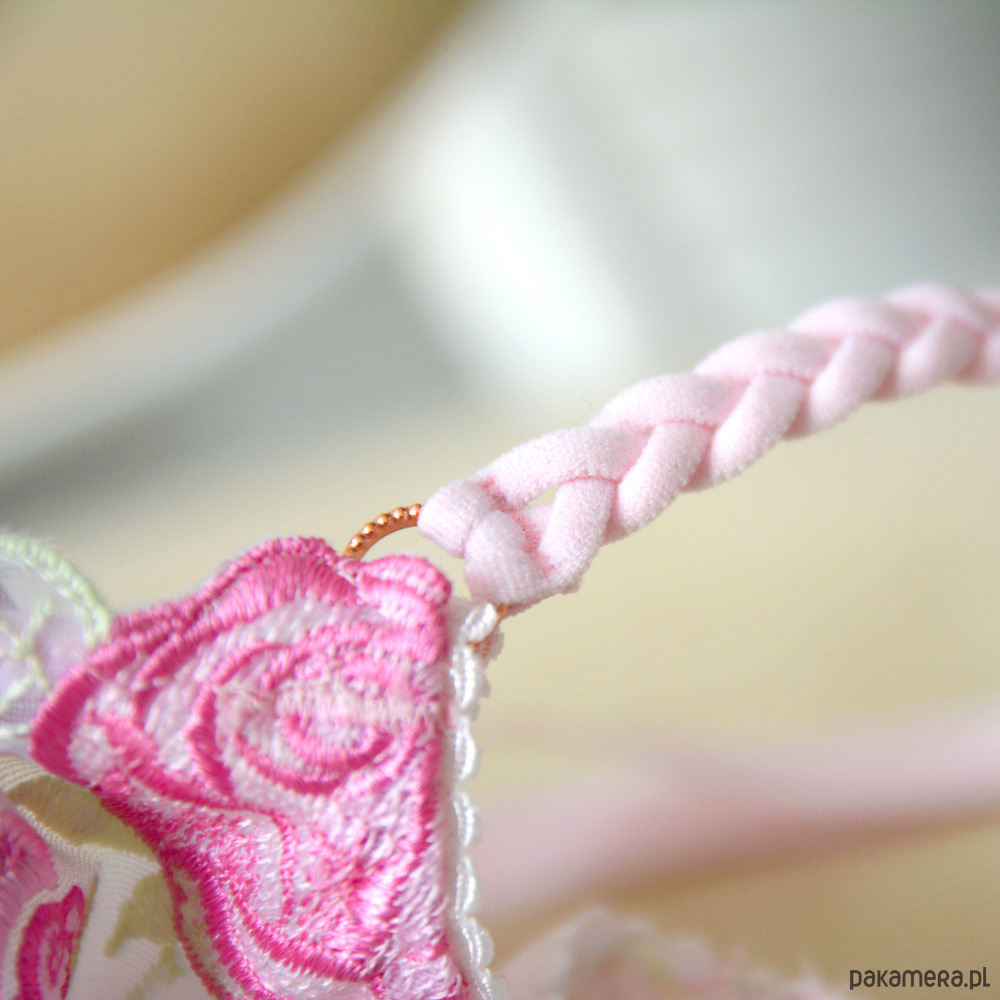 Biustonosz Mrs. Rose uszyliśmy z romantycznego, różanego haftu, który jest niezwykle przyjemny dla skóry. Całość ozdobiliśmy dodatkami w kolorze różowego złota.