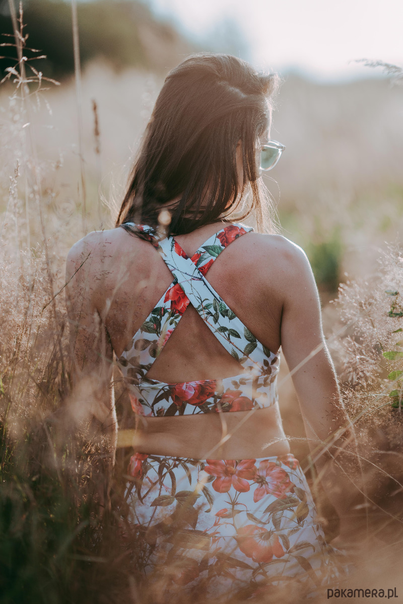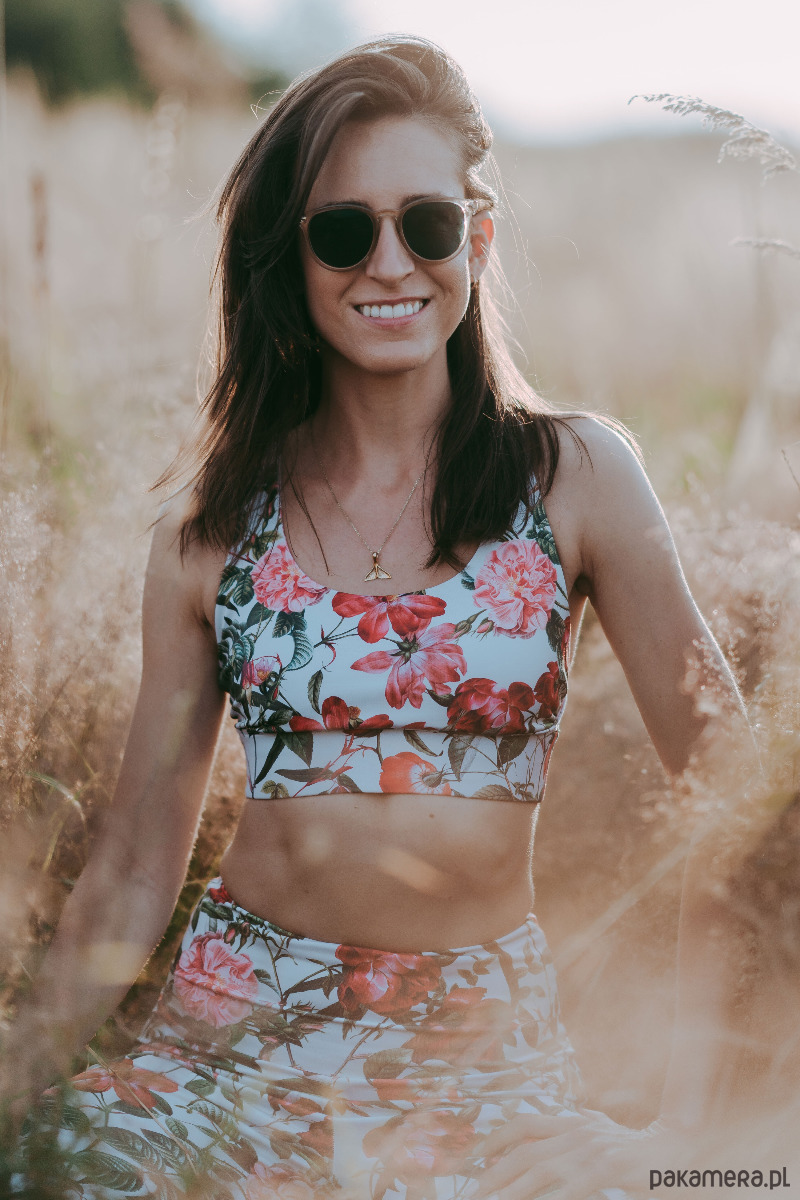 Po upraniu materiał szybko schnie bez deformacji. Skrzyżowane na plecach grube paski sprawiają, że top utrzymuje się na miejscu nawet przy najbardziej złożonych ruchach. Gąbkowe wkładki utrzymują ładny kształt biustu, bez efektu spłaszczenia. Top wykonany z materiału w oryginalny kwiatowy motyw, dzięki czemu doskonale dopełni każdy strój sportowy. Możesz go także połączyć z naszymi legginsami do jogi lub legginsami w fasonie dzwonów.