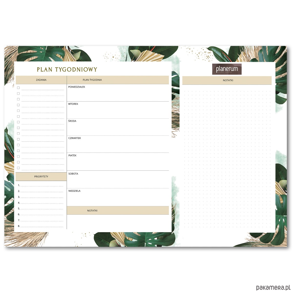 Zapraszamy do odkrycia eleganckiego i funkcjonalnego narzędzia do planowania – biuwaru w formacie A3 (dostępny także w A4) z pięknym motywem tropikalnym. Idealny zarówno do domowego biura, jak i profesjonalnego miejsca pracy. Dzięki temu produktowi Twoje tygodnie staną się lepiej zaplanowane, a lista zadań — bardziej przejrzysta.
