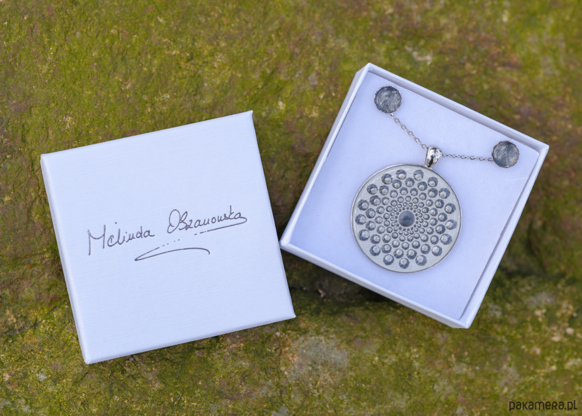 Mandala została namalowana ręcznie specjalnymi farbami na medalionie ze stali chirurgicznej, następnie do utrwalenia została zalana żywicą epoksydową.