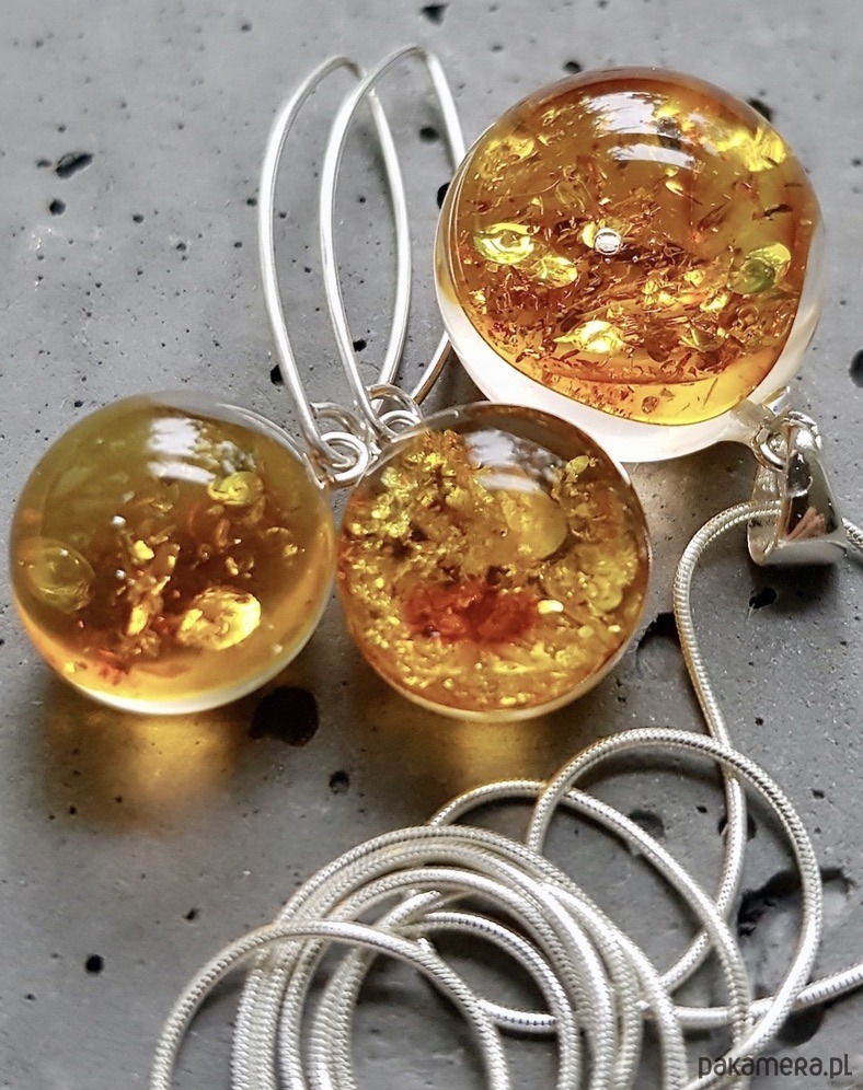 Wyjątkowy komplet biżuterii z żywicy - wisior i kolczyki w których na zawsze zatopiłam mieniący się bursztyn. Ten wyjątkowy zestaw minimalistyczny zapakowany jest w eleganckie pudełko jubilerskie. Unikatowa biżuteria autorska to doskonały prezent dla bliskiej osoby.