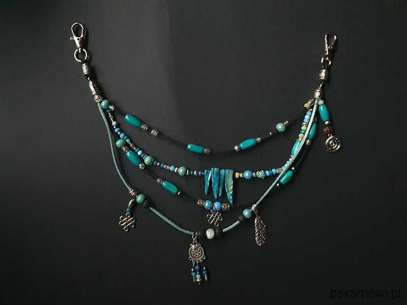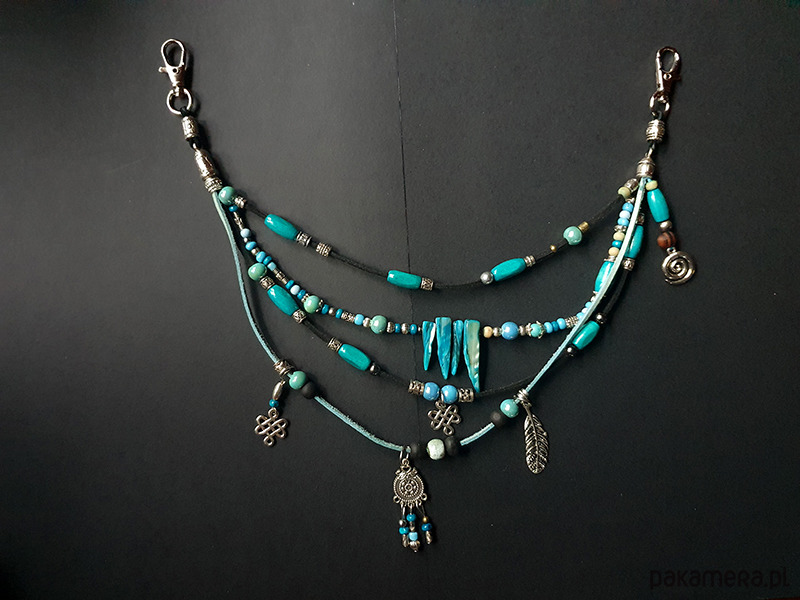 Użyłam koralików wykonanych z metalu w kolorze srebra i starego złota, drewniana woskowanego i barwionego, szkła oraz ceramiki szkliwionej, kły wykonane są z masy perłowej.