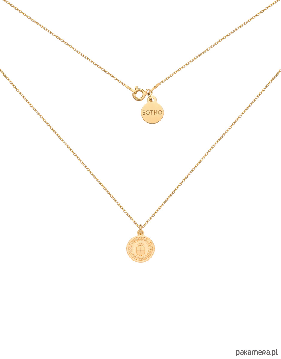 Złoty naszyjnik łańcuszkowy z medalionem i zawieszką z logo marki. Całość wykonana ze srebra 925 powlekanego 24 karatowym żółtym złotem.