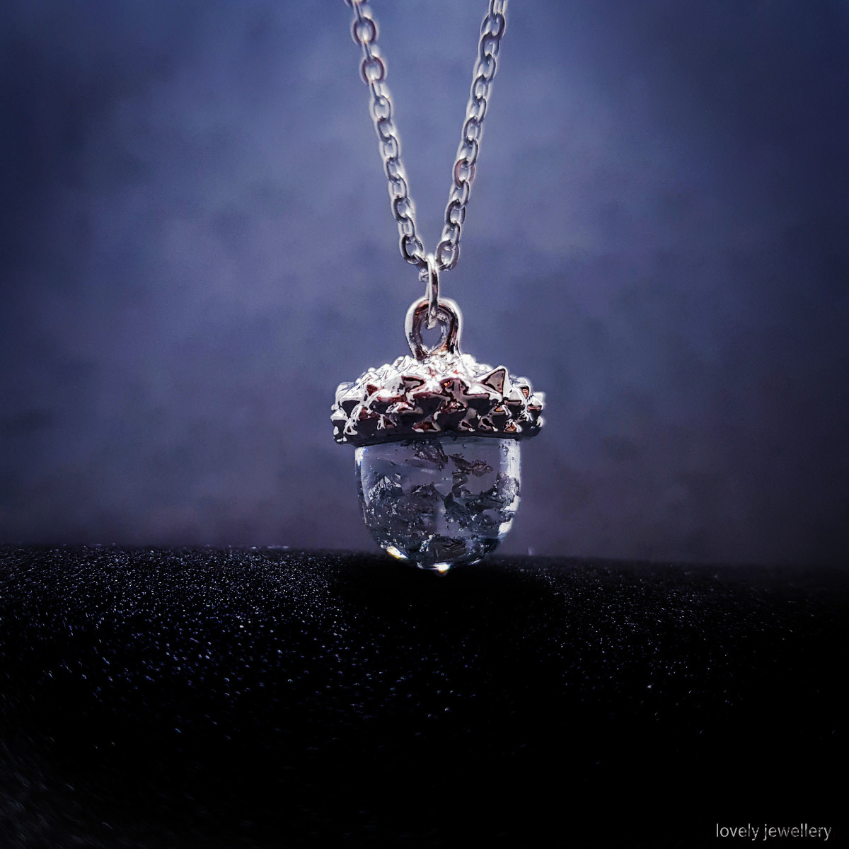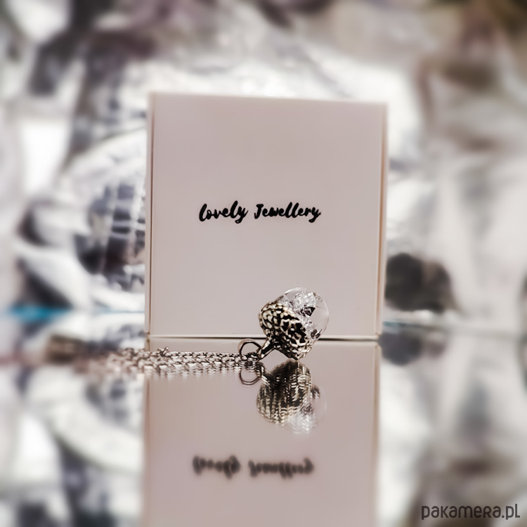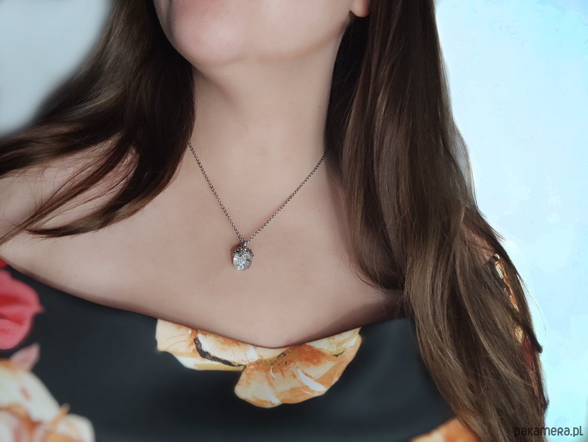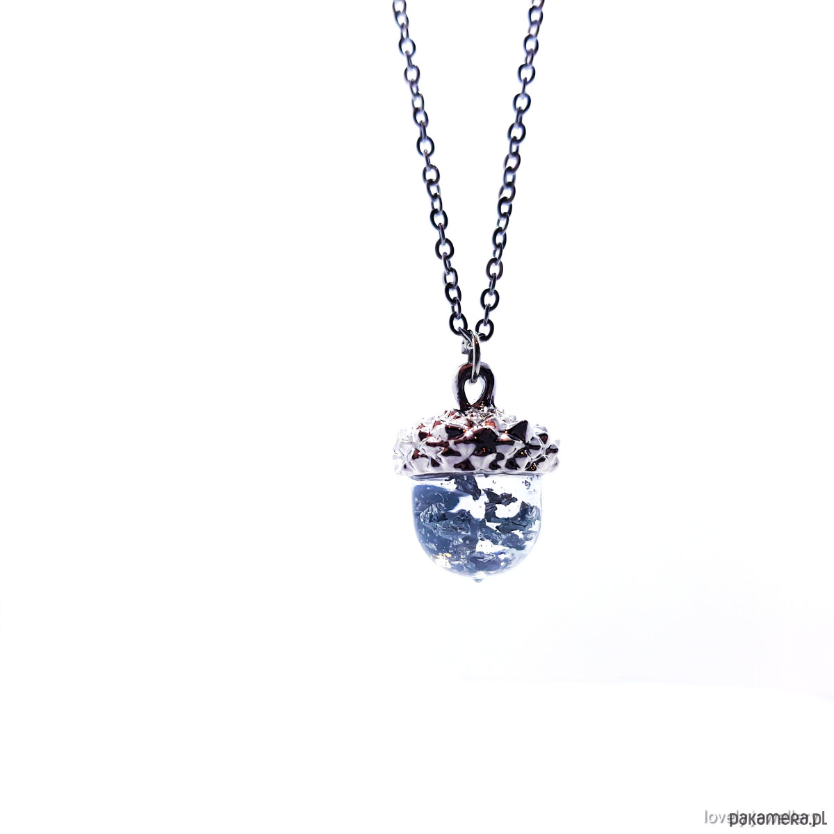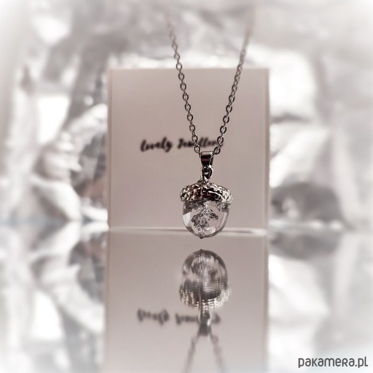 Naszyjnik razem z wisiorkiem w kształcie Żołędzia wykonany w pracowni Lovely Jewellery. W środku wisiorka znajdują się płatki srebra.