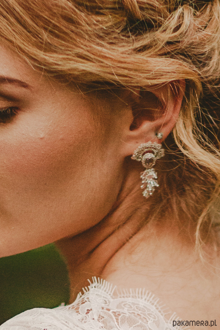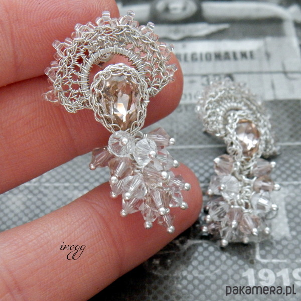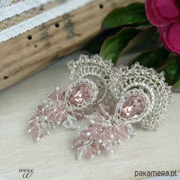 Wyjątkowe i oryginalne kolczyki ślubne utkane ze srebra pr. 930 i 999 . Delikatne i romantyczne, w kolorze pudrowego różu. Kryształy oprawione w misterne, srebrne koszyczki dodają uroku wielu stylizacjom ślubnym. Całkowita długość kolczyków wynosi 4cm.