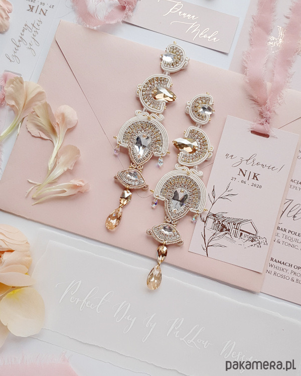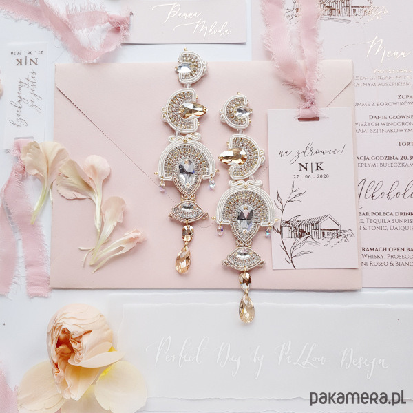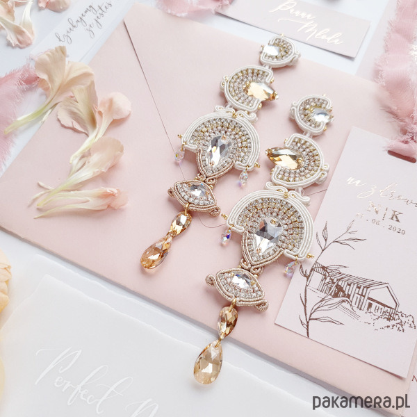 Kolczyki zostały wykonane ręcznie z jedwabistych pasm sutasz w kolorze ivory. Sercem tej niezwykłej biżuterii są kamienie Swarovski w kolorach golden shadow (szampan) oraz crystal. Kamienie te otaczają wianuszki drobniutkich cyrkonii Preciosa, tworząc niesamowitą grę światła.